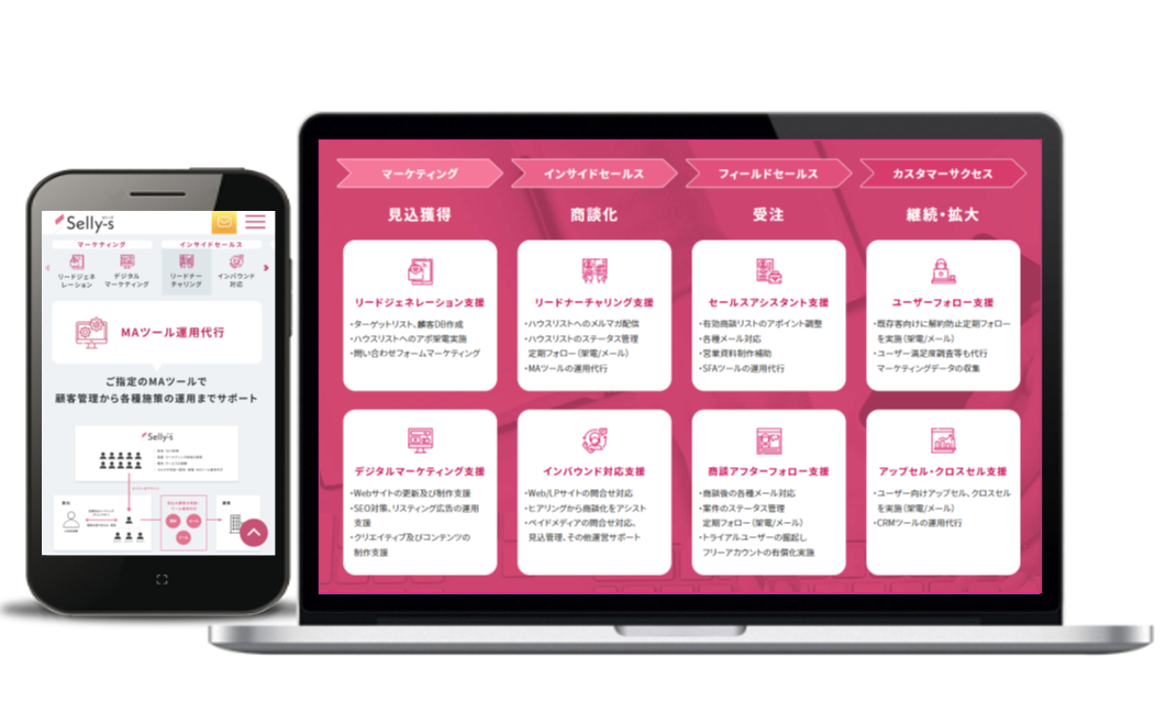 現在ではBtoB企業を中心に営業オンラインアシスタントサービス『Selly-s(セリーズ)』の運営を主軸にマーケティング活動に最適な仕組み作りを支援しています。