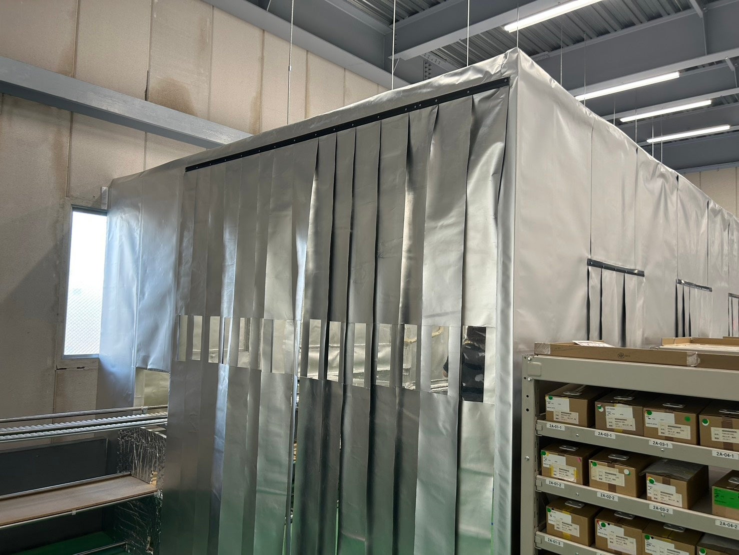 ・特殊遮熱加工を施した透明ビニールカーテンを、壁面上部に 設置し、外部の熱を遮断