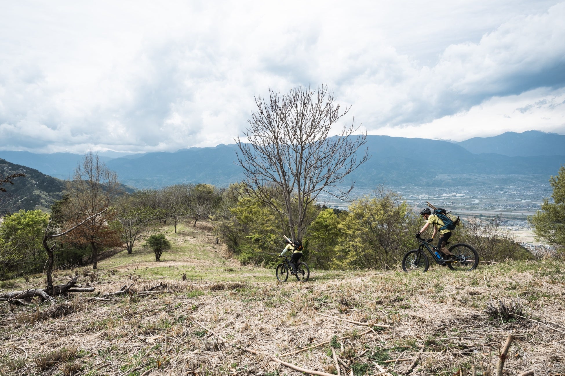 E-MTBの機動力を活かし、参加者はトレイル整備道具を背負ってトレイルを走行し作業箇所へ向かう。