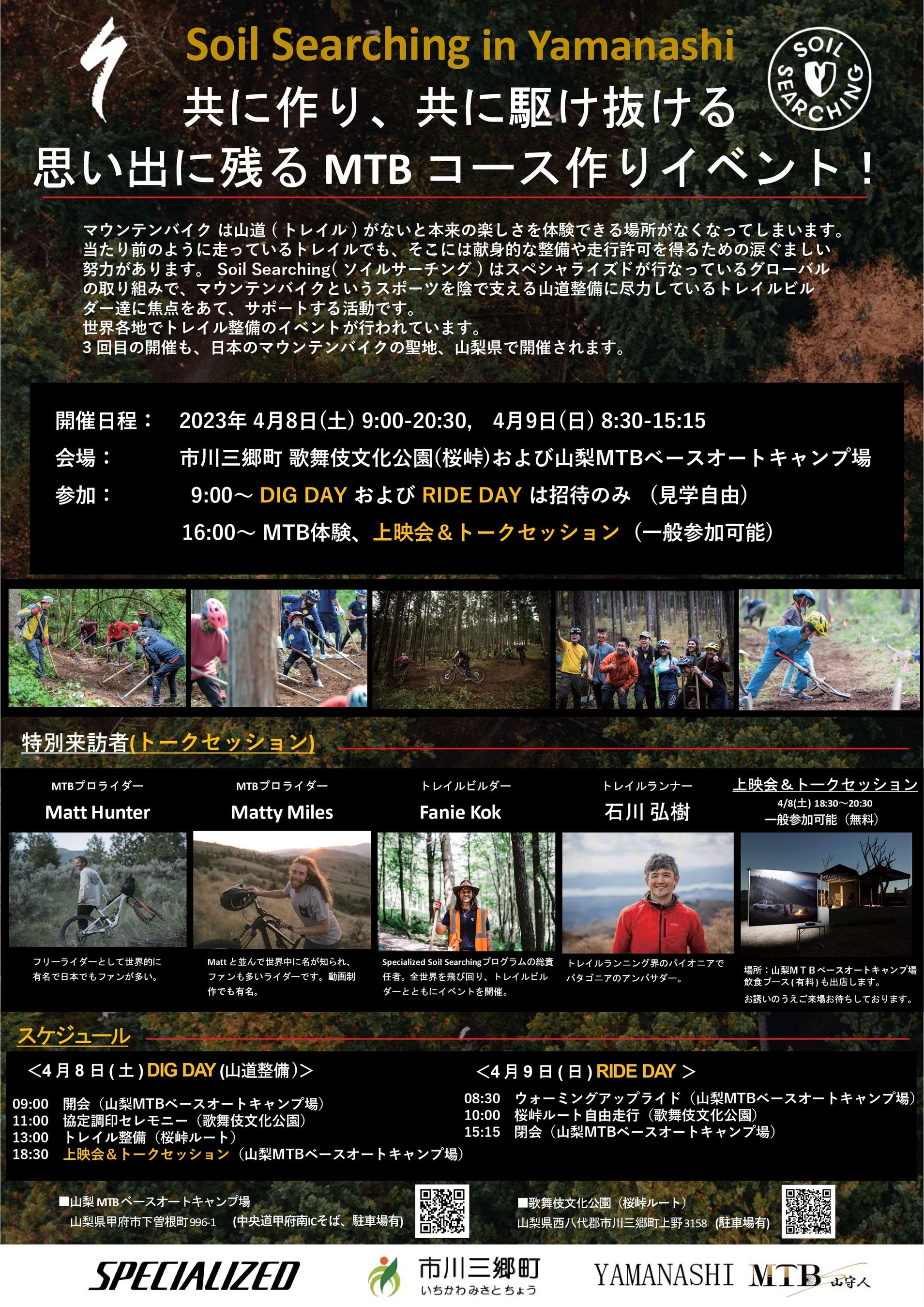 そのために、世界的にも著名なマウンテンバイクライダーのMatt Hunter(マットハンター)やMatty Miles(マッティマイルス)、スペシャライズド社のSoil Searching総責任者のFanie Kok(ファニークック)が来日し、トレイルランナーの石川弘樹さんも駆け付けました。