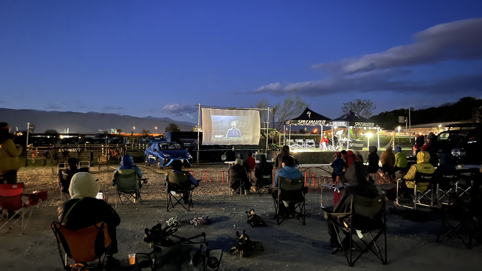 山での作業が終わり、山梨MTBベースオートキャンプ場に戻ってくると、飲食店ブースが設営され、地ビールや地元食材の料理を楽しみながら、MTBやトレイルに関する映像の上映会を楽しんだ。
