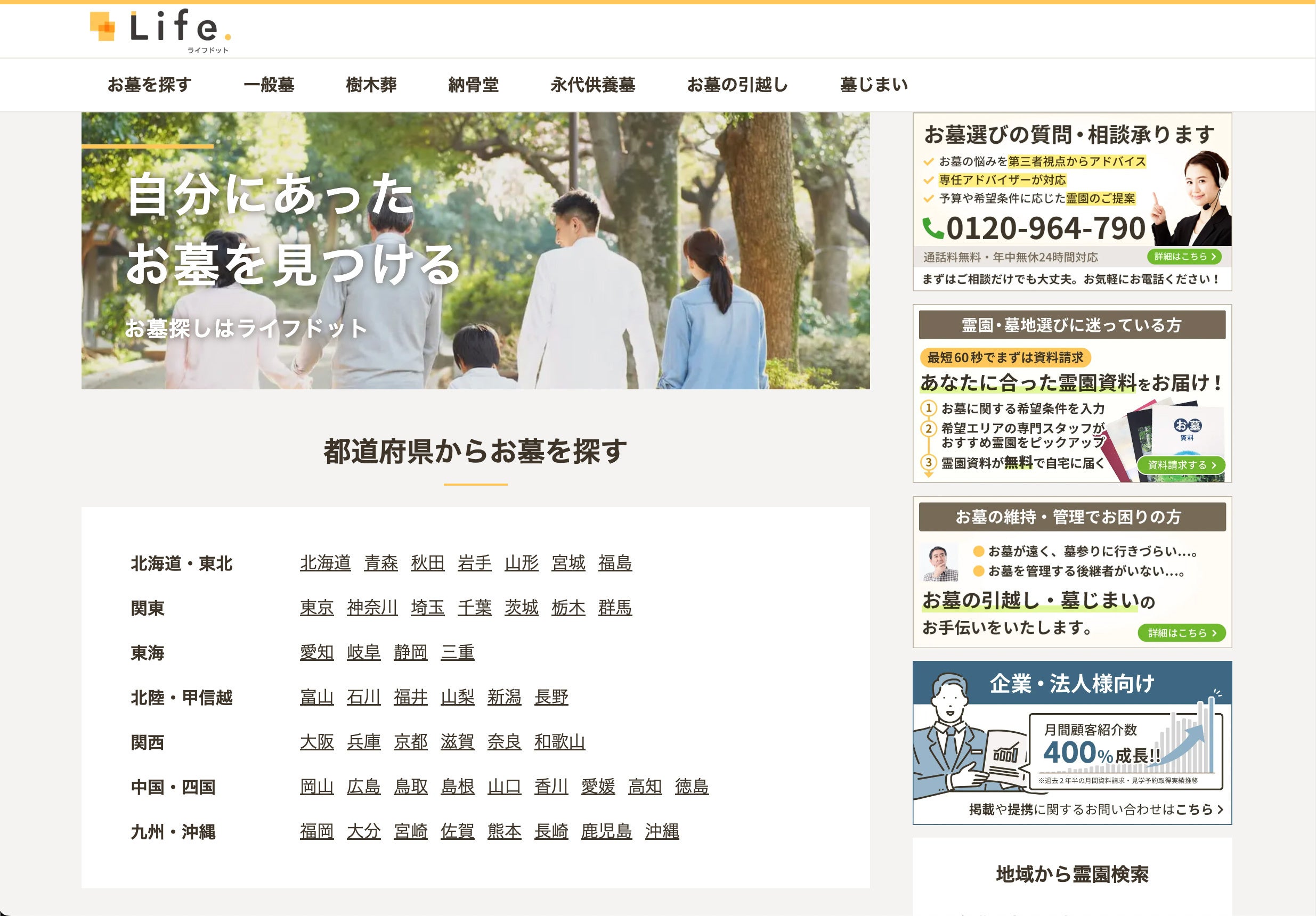全国の墓地・霊園情報(一般墓・樹木葬・納骨堂・永代供養墓)や、墓じまいなどのお役立ち情報を発信しているライフエンディングの総合サービス「Life.(ライフドット)」のほか、暮らしに役立つさまざまなサービスを運営しています。