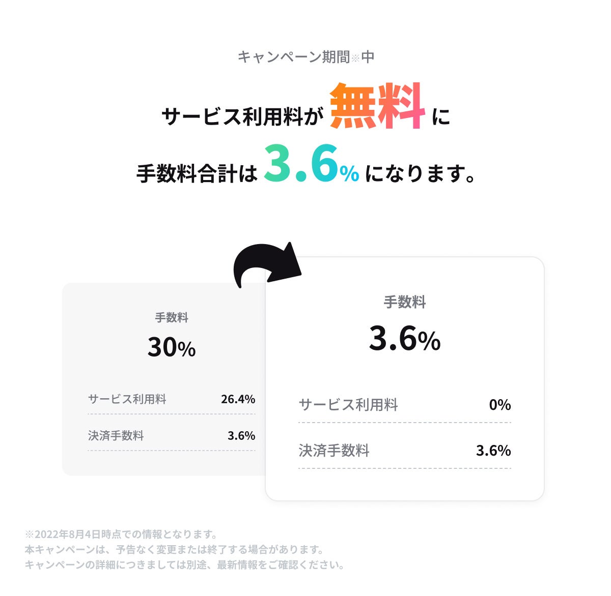 mishは今まで、オーナー様から売上の30%を手数料として頂いており、これは「サービス利用料26.4%」と「決済手数料3.6%」の合計となっていました。今回のキャンペーンでこのサービス利用料26.4%を0%(無料)に変更し、手数料合計を3.6%へと大幅に引き下げます。