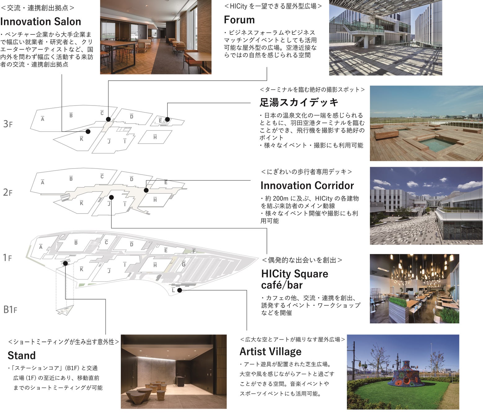 HICityは、「先端」と「文化」の2つをまちのコア産業として、多くの特徴的な機能を内包し、先端技術による実証実験の取組みや、日本独自のカルチャー体験の機会を提供します。また、オフィスワーカー、研究者、クリエーター、国内外からの観光客や来街者など、多種多様な人々が集い、互いに刺激し合うことで「先端」と「文化」が融合し、ヒト・モノ・情報の分野を超えた交流と新たなビジネスを創造します。
