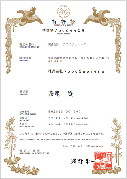 株式会社RoboSapiensは、巻尺の機構を用いることでコンパクトな収納スペースから大きな伸縮を実現した伸縮アクチュエータを製品化。既に関連特許を4つ取得しています(#1)。そして、今回の「突出型リニアアクチュエータ」に関する発明は、RoboSapiensにとって、伸縮アクチュエータ/ロボット領域で5つ目の特許となります。