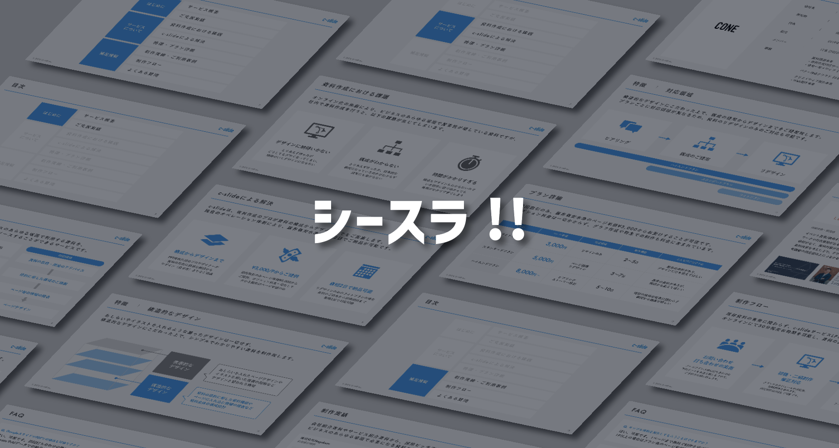 c-slide(シースライド)とは「プロによるビジネス資料を、個人発注の価格で」をコンセプトに、ビジネスのあらゆる場面で必要となる資料の企画構成からビジュアライズまで全ての資料作成を代行します。累計支援企業200社を突破し、成長を続けております。