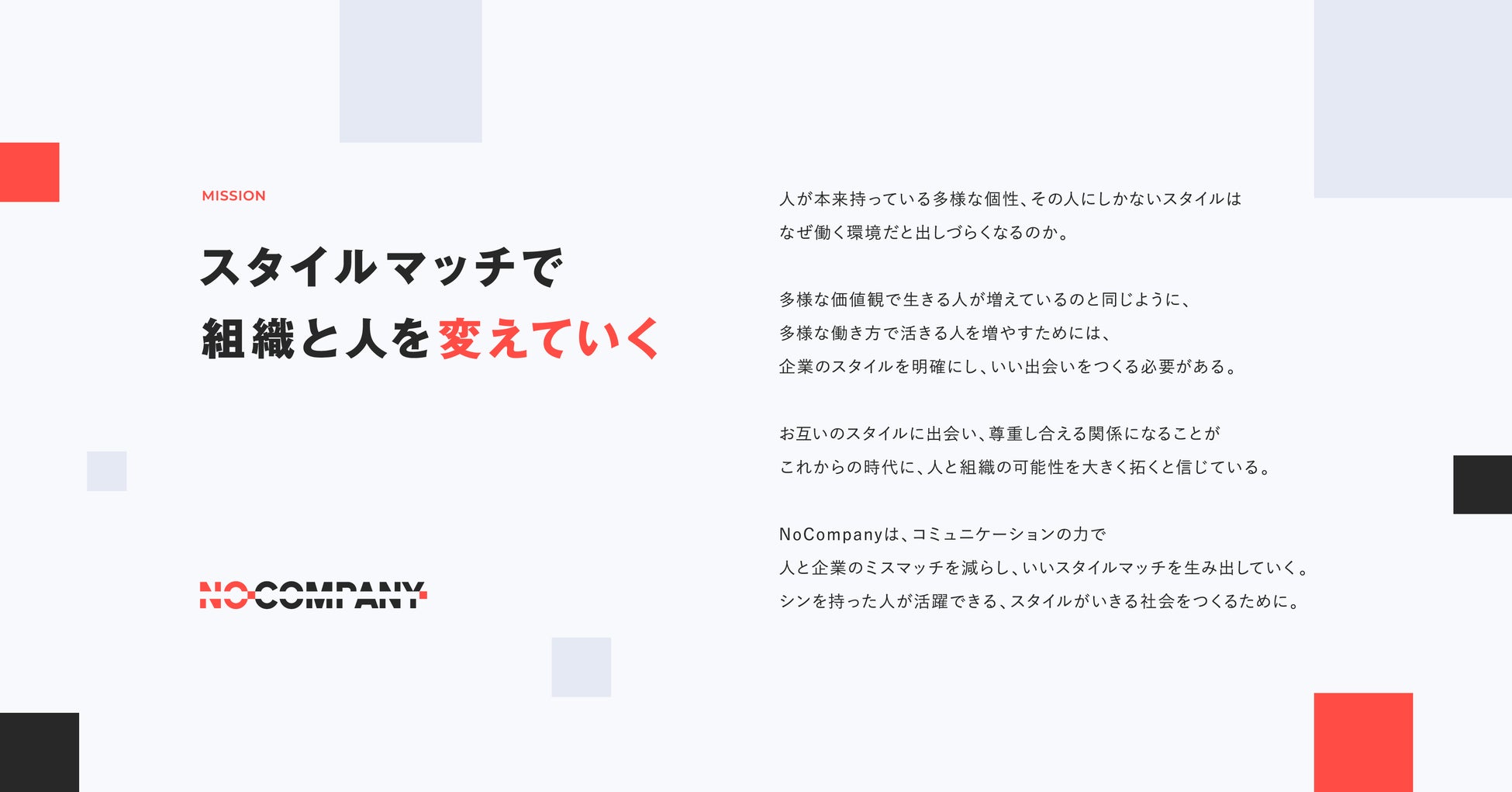 このたび、No Companyではこの「スタイルがいきる社会」を実現させるために、新たに「スタイルマッチで組織と人を変えていく」ことをミッション(注力領域)に掲げます。今後「スタイルマッチ」を支援する企業として、採用マーケティング市場を牽引していきたいと考えています。