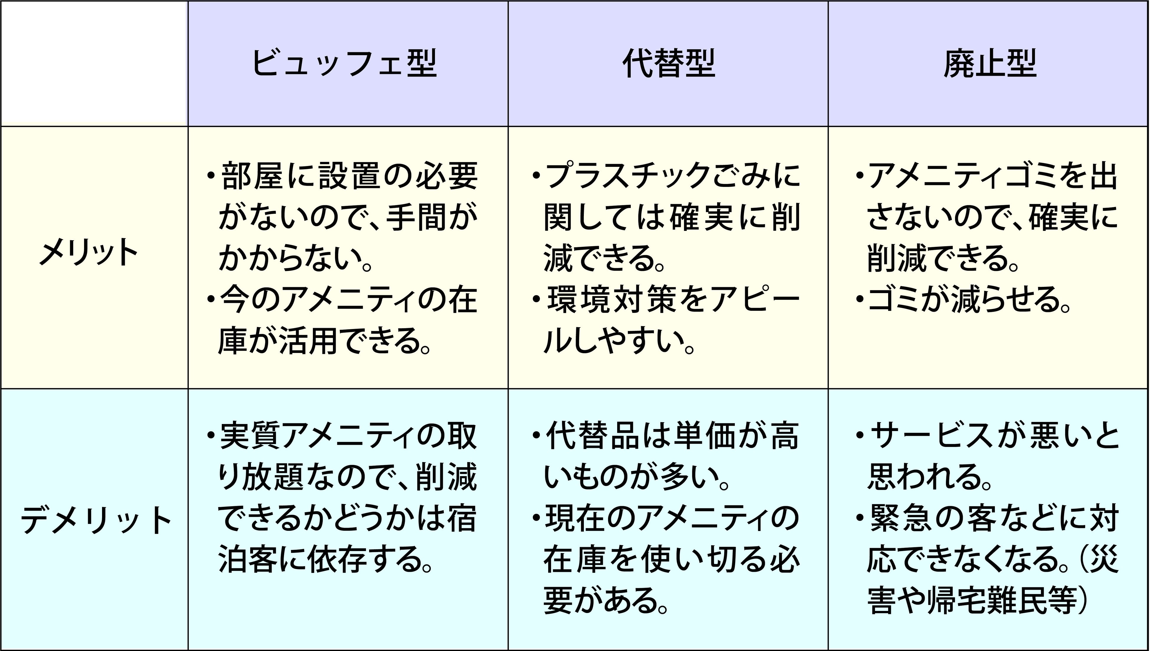 プラスチック製アメニティの消費を抑えるために各施設が講じている対策としては、アメニティをフロントに設置する「ビュッフェ型」、アメニティをプラスチック以外の素材にする「代替型」、そもそもアメニティ自体を設置しない「廃止型」等、大まかにはこの3パターンの傾向が見られる。