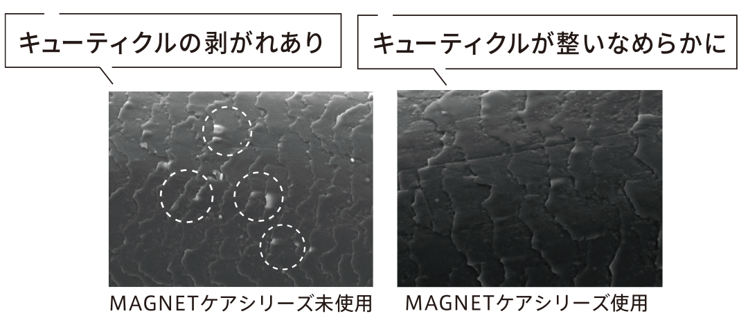 *MAGNETケアシリーズ未使用とMAGNETケアシリーズ使用での比較データは同一人物の毛髪で計測