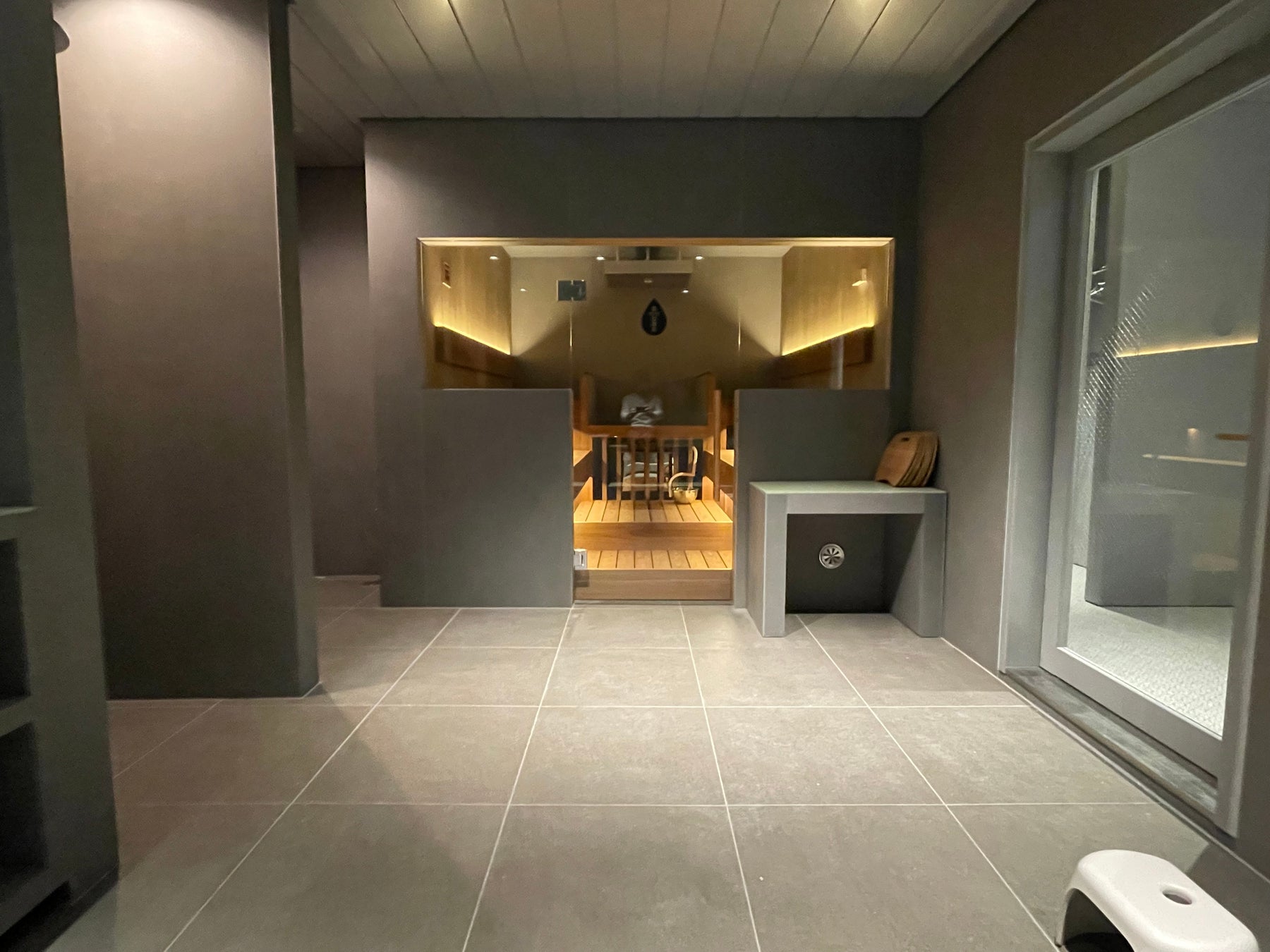 一方で、お風呂側から見たサウナ室は グレートーンの落ち着いた壁 に暖かな照明を組み合わせ、サウナ室が柔らかく浮かび上がるような美しいコントラストを生み出しました。