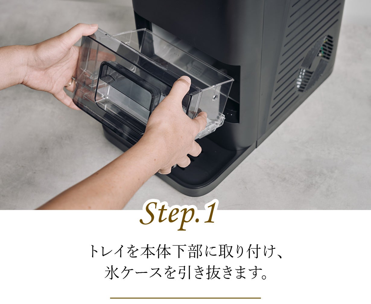 本製品は、給水してボタンを押すだけで直径約5cmの丸氷が1時間毎に2個完成します。