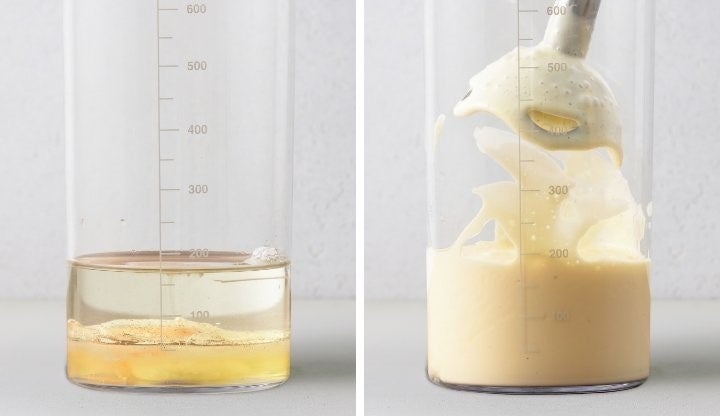 ④混ぜる:目盛り付きの付属カップを使ってマヨネーズやパスタソースがムラなく完成。