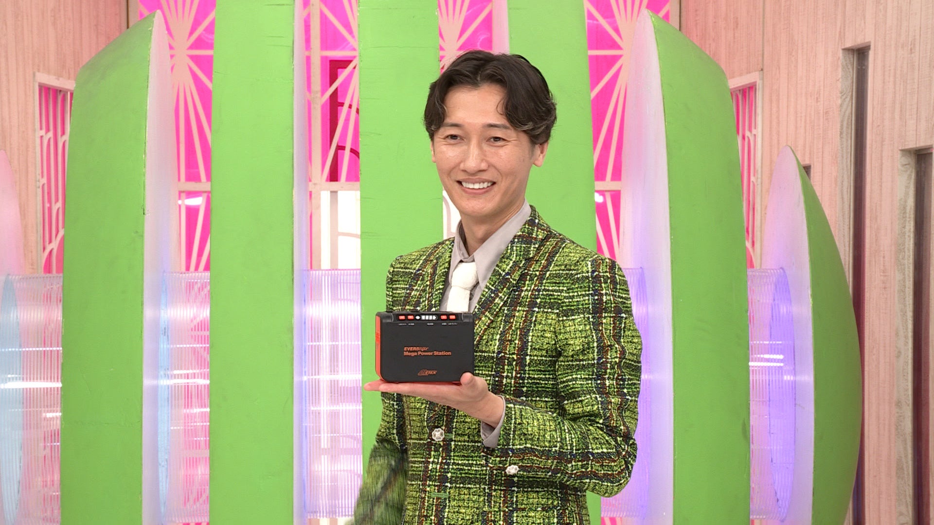 家電王子・後上翔太が紹介するのは『メガパワーステーション・ソーラーパネル特別セット』。災害時だけではなくアウトドアでも役立つ多機能ポータブル電源に一同感嘆!