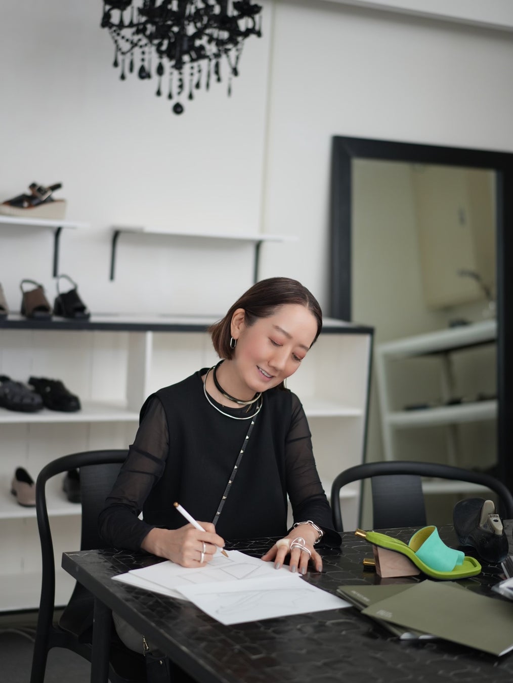 繊細なタッチのデザインワークには学生時代の作品づくりが背景にある靴メーカーでチーフデザイナーに携わった後、