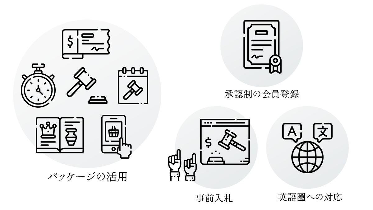 当社が自社開発してきたオークション構築パッケージをベースに導入することで、低コストかつ短期間での開発とリリースを実現しつつ、将来的な機能拡張にも柔軟に対応可能です。
