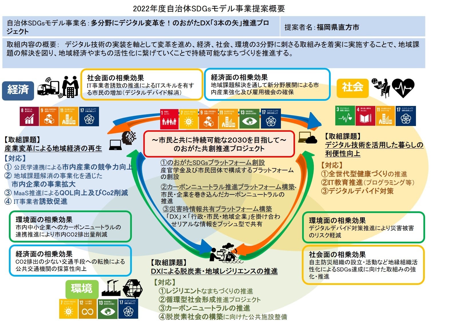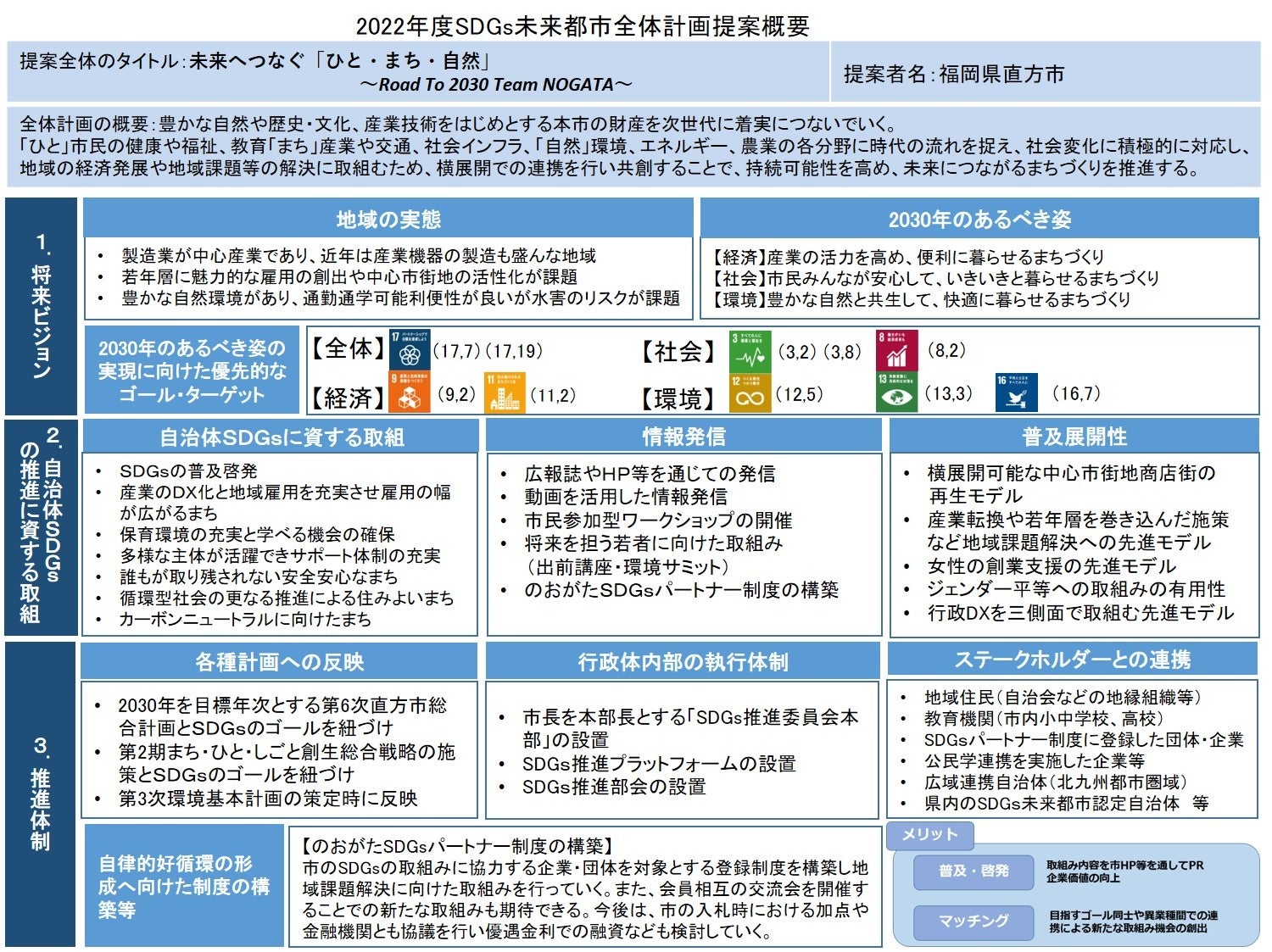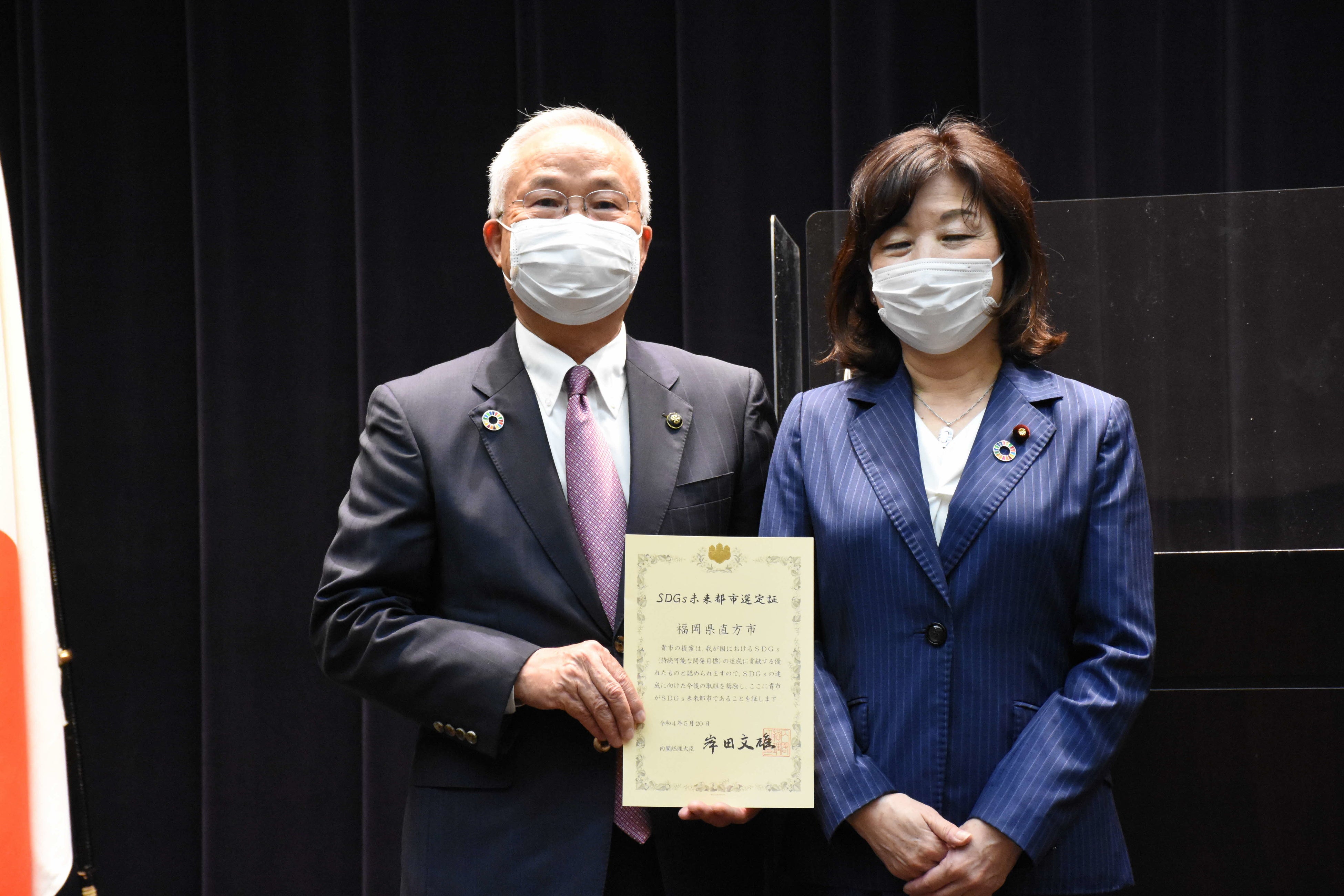 直方市の提案するSDGs(持続可能な開発目標)の達成に向けた計画「未来へつなぐ「ひと・まち・自然」~Road To 2030 Team NOGATA~」が、SDGsの達成に向けた優れた取組として認められ、国(内閣府)から「SDGs未来都市」に選定されました。令和4年5月20日に選定証授与式が行われ、直方市も全国30都市とともに選定証を授与されました。