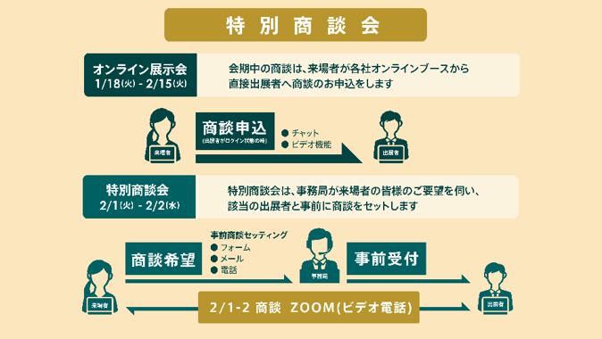 当日の流れは商談時間と合わせて、事務局より別途ご案内させて頂きます。