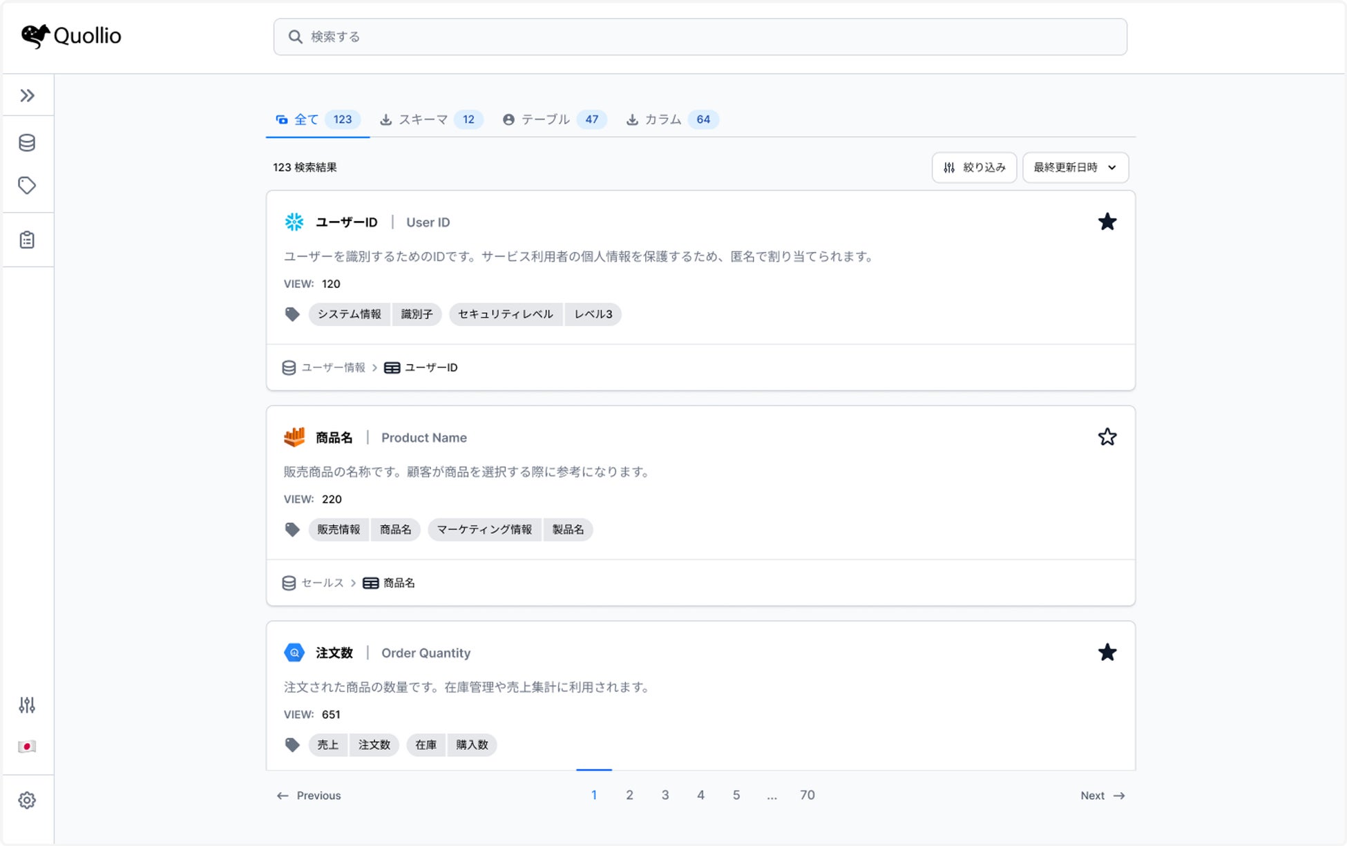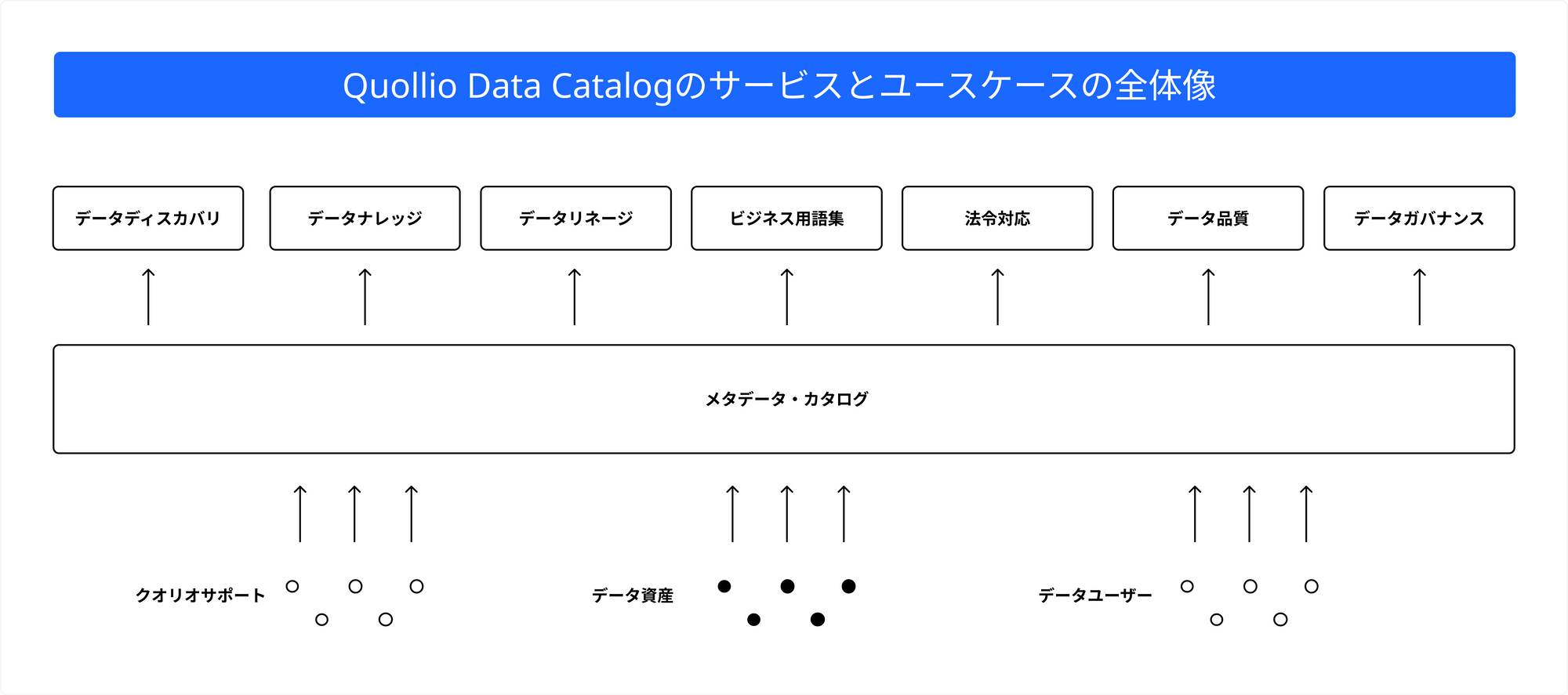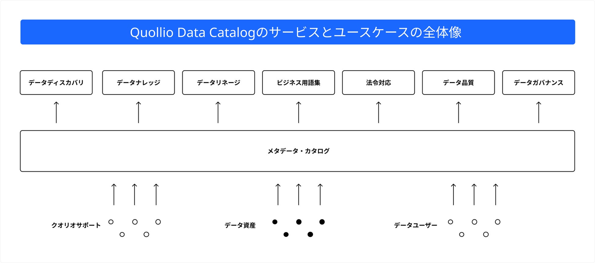 「Quollio Data Catalog」では、メタデータのモダンな管理技術を提供し、大規模なセルフサービス分析やデータガバナンスの促進を支援します。これにより企業は、価値あるデータの選定から活用までのリードタイムを最小化し、希少なデジタル人材がデータ探索への格闘に日々終始する事態を防ぐことができます。また統制的な側面から、個人情報保護法やBCBS239を始めとする、データに関するリスク対応の加速も見込めます。