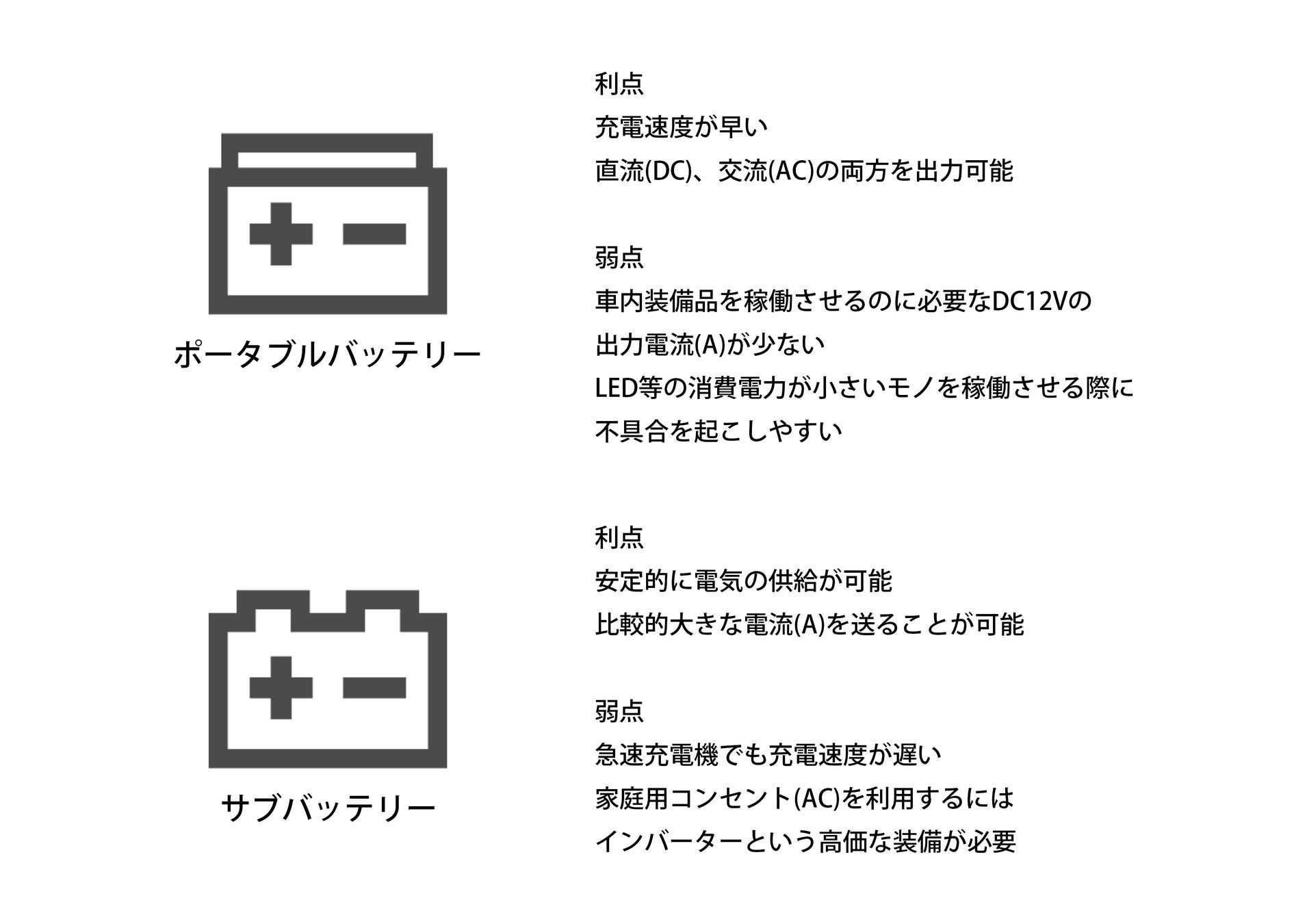 充電は基本ポータブルバッテリーが行い必要に応じてサブバッテリーへ供給します。出力はAC100VポータブルバッテリーがAC100VをサブバッテリーがDC12Vをそれぞれ出力する事によりお互いの得意な作業を担うようになっています。これにより充電時間の短縮、電装品への電源供給の安定化、そして複雑な作業をポータブルバッテリが担うことでシステムが単純化するためコストの削減など多くのメリットがあります。総容量は500Aでこれはサブバッテリー5個分の容量になります。