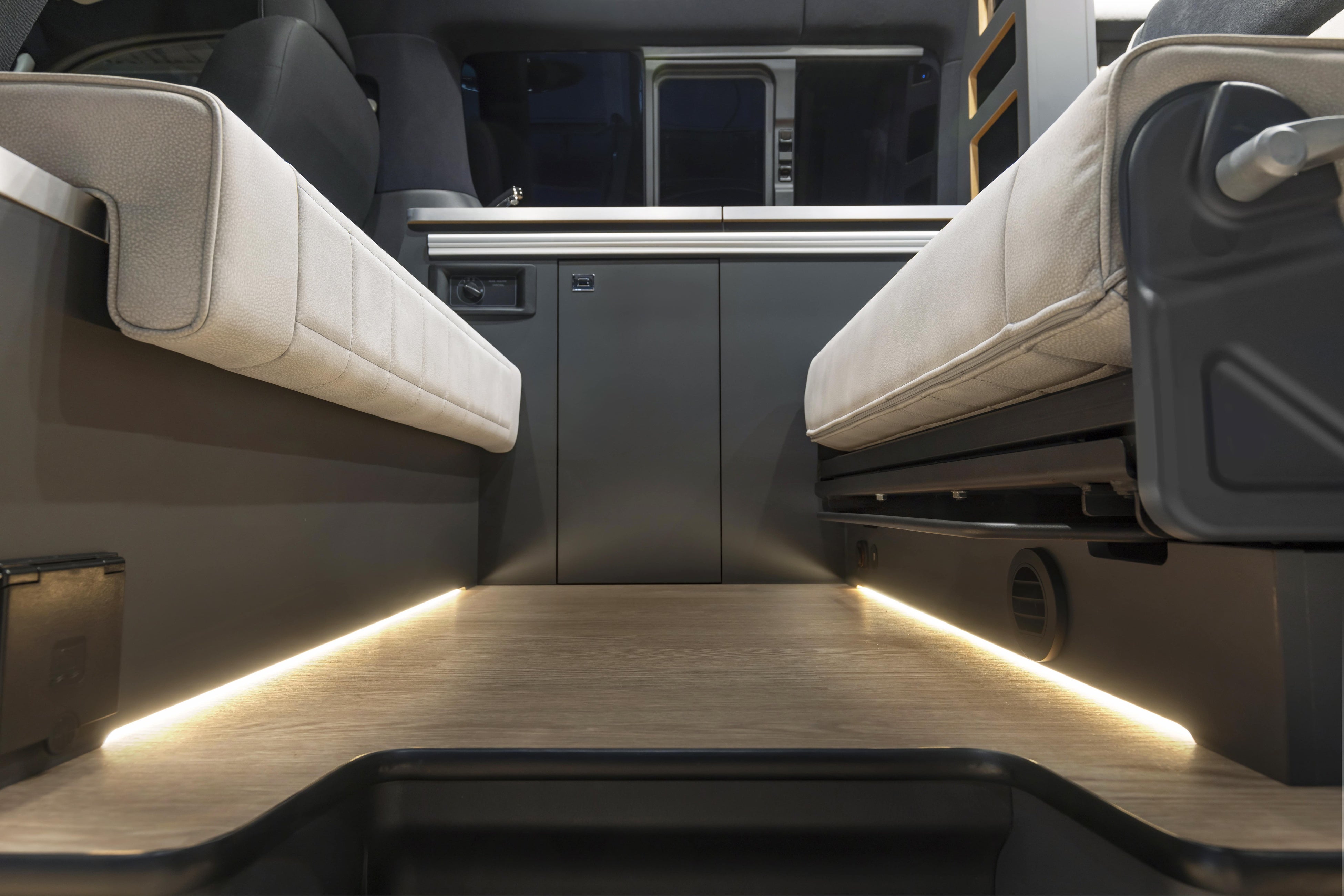対面で座れるリビングスペースは、軽食やコミュニケーションの場として利用できます。素材は、キャンピングカーの本場ヨーロッパのベルギー製のレザーを採用。触り心地等の生地感の良さだけでなく自動車の装備としても必要な難燃性も高いものになっています。