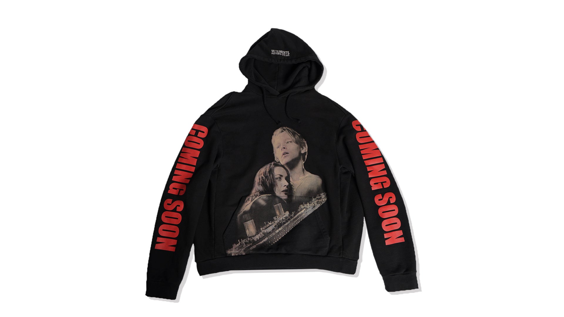 1997年公開の映画「タイタニック」のビジュアルを前面にプリントし、袖には「COMING SOON」の文字をあしらった大胆な作品。ヴェトモンの中でもカルチャーを反映させた初期の作品であり、未だに高い人気を誇っています。その後、20年春夏に「スターウォーズ」、22年春夏には「プラダを着た悪魔」をオマージュした作品などが次々に発表されており、まさに原点と呼べる作品となっております。