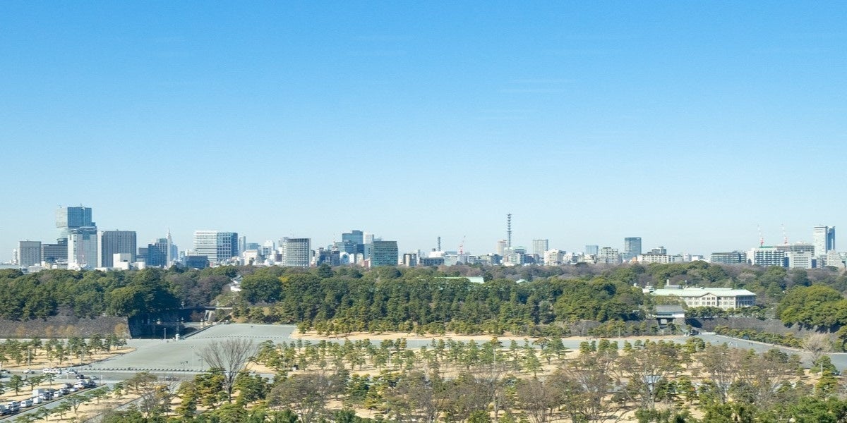 オフィス奥の大きな窓からは、皇居を一望することができ、四季折々の自然を楽しめます。