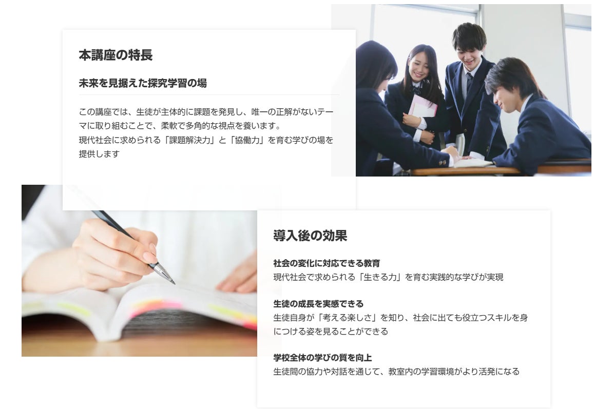 本講座は、高等学校学習指導要領(平成30年告示)の「総合的な探究の時間」に準拠しており、「課題の発見と解決に向けた探究的な学習活動」や「社会との関わりを通じた学習の深化」などの指導方針に合致しています。これにより、学校教育の充実に貢献するとともに、生徒が実社会での課題解決能力を養う機会を提供します。