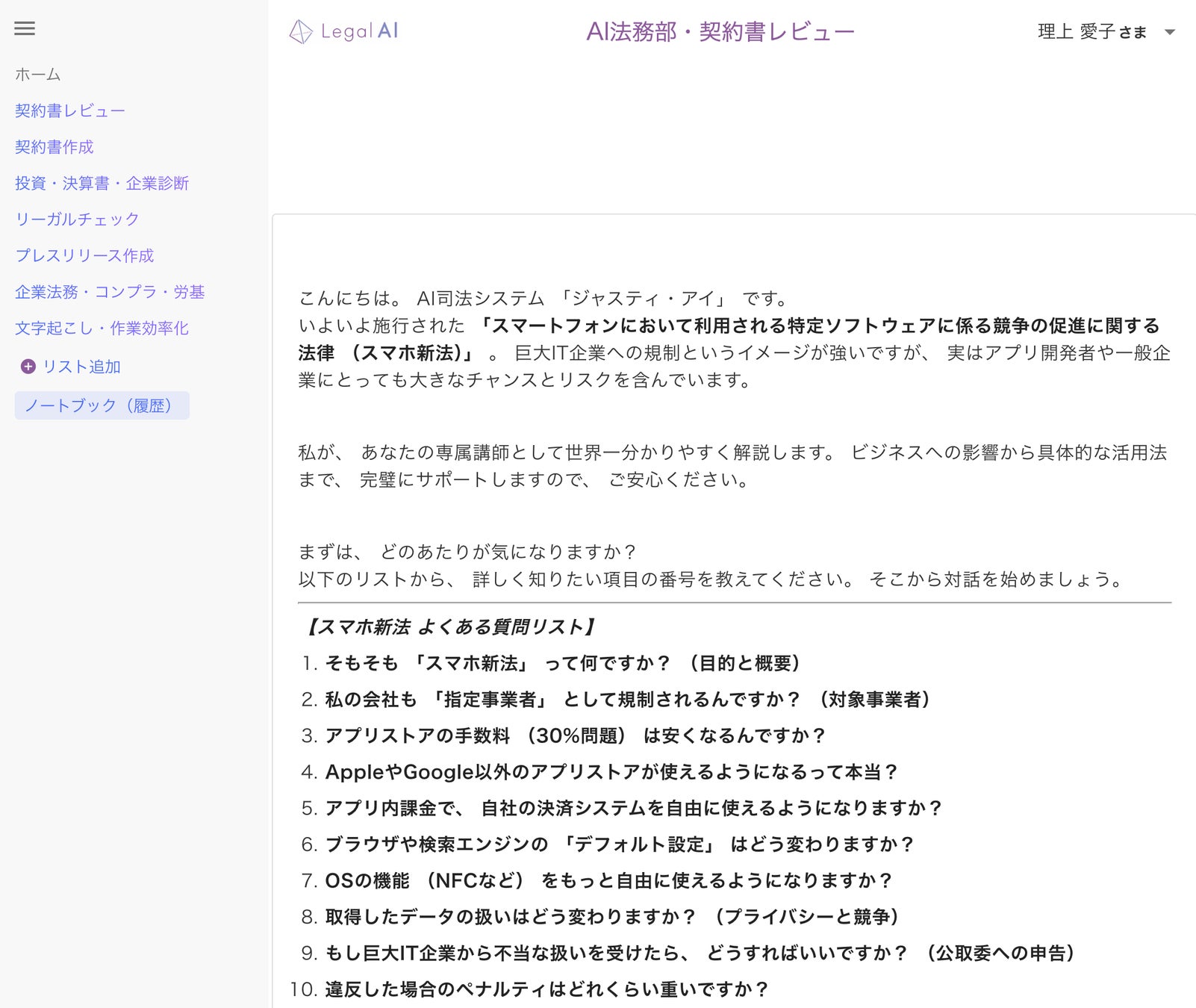 本サービスは、スマホ新法の条文、政令、ガイドラインを学習したAIが、対話形式でユーザーの課題を解決します。