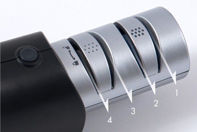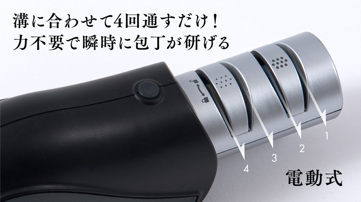 【マスターシャープナープロ】は異なる角度の溝に1回ずつ通すだけで、だれでも簡単に包丁の切れ味を復活させられる電動式のシャープナーです。