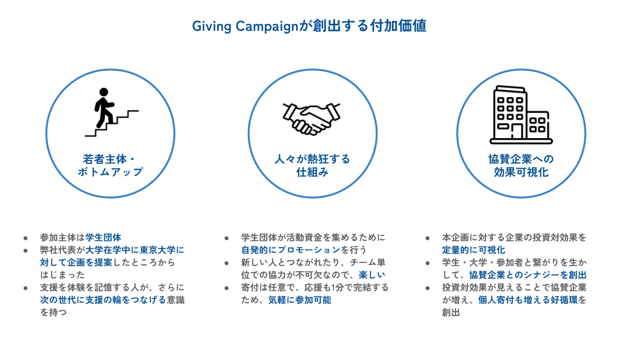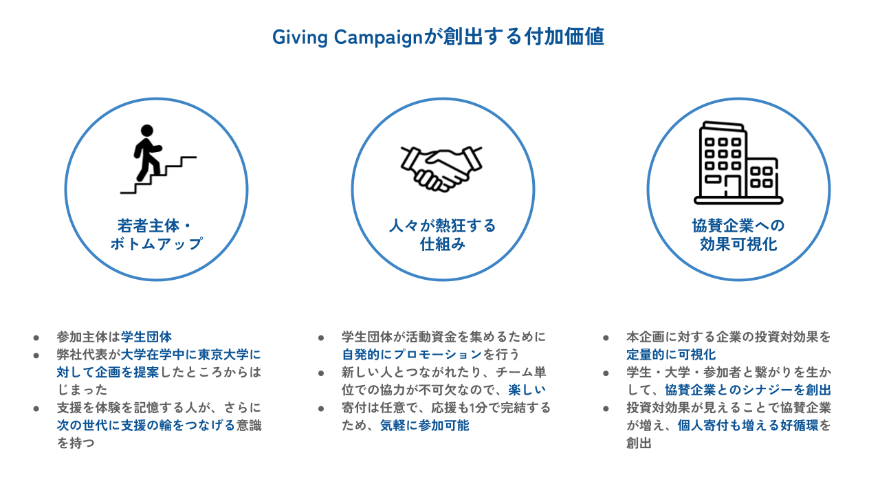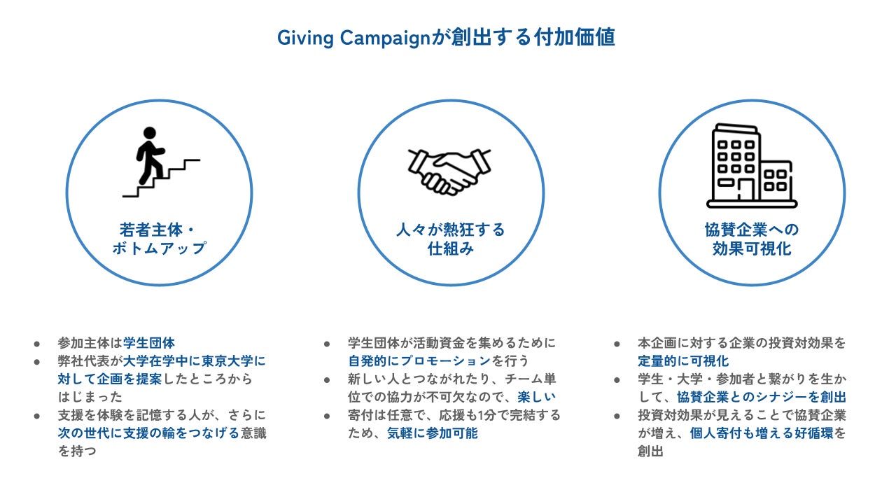 「Giving Campaign 2023」は、各大学の支援者ネットワークの拡大・活性化と寄付文化醸成を目的としています。本取り組みにご賛同いただいたパートナー企業から募った支援金を、イベント期間中に各大学の学生団体(研究室・部活動・サークル等)が集めた応援数などに基づいて、大学基金および学生団体に分配する取り組みです。また、イベント期間中には学生団体を応援する個人からの寄付も可能となっています。