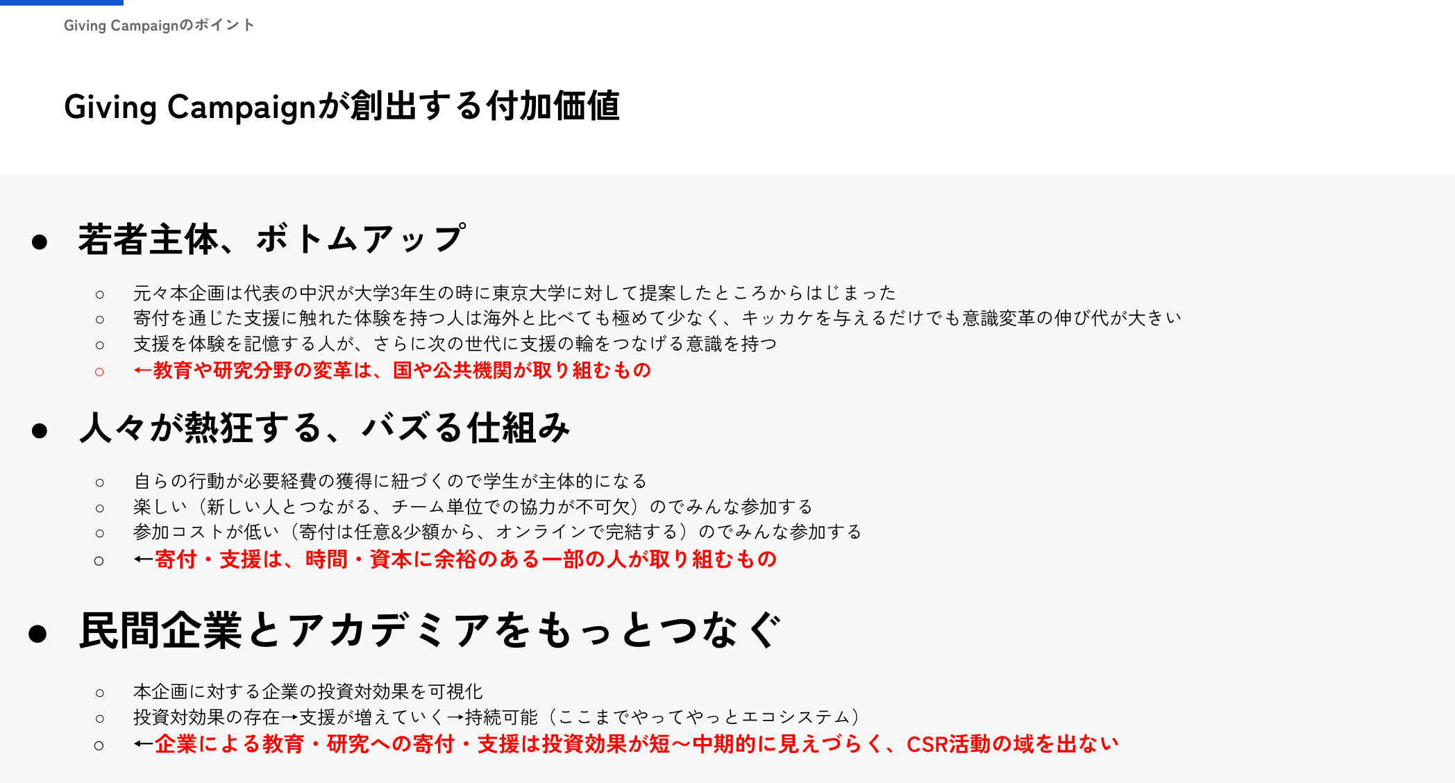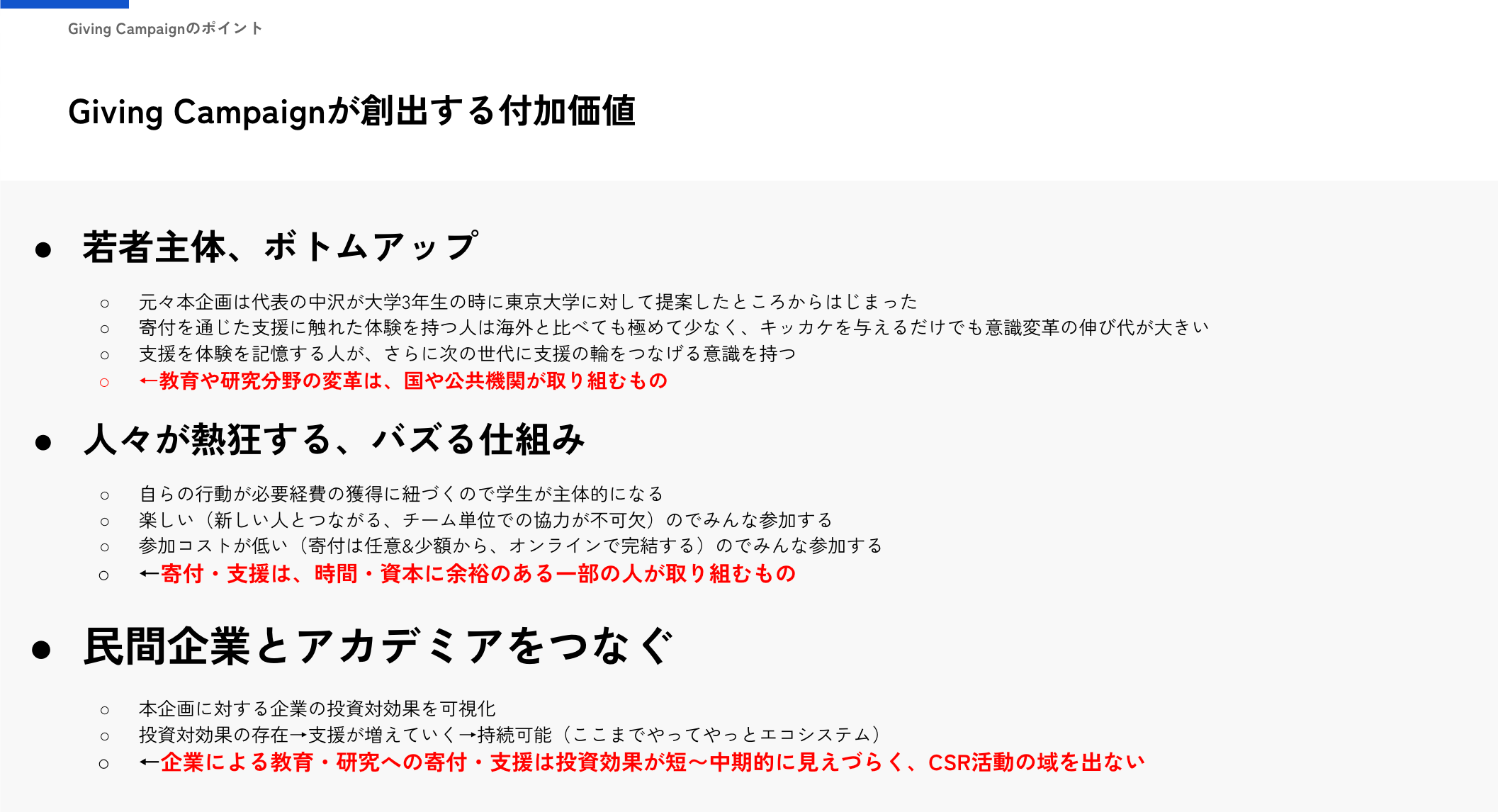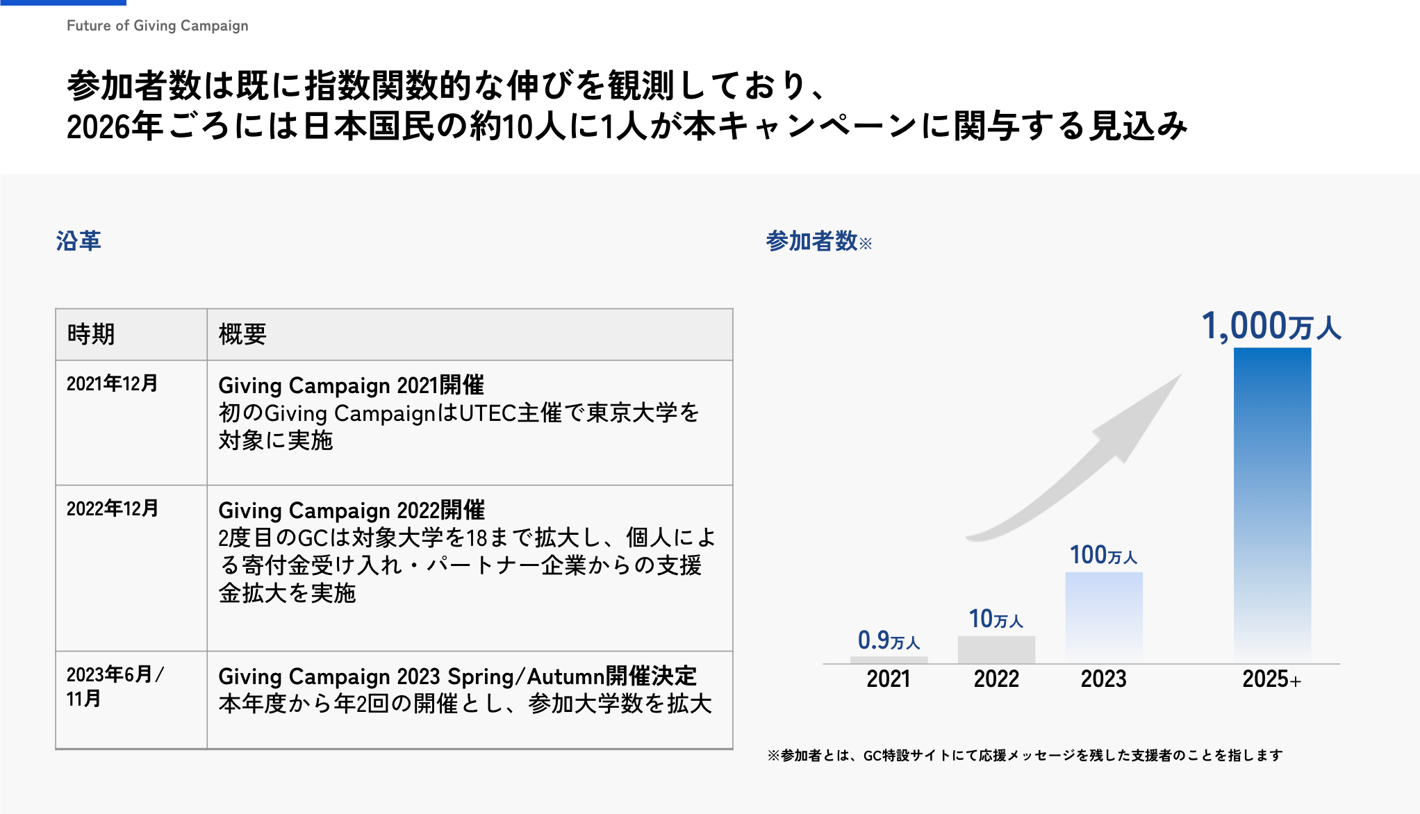 「Giving Campaign 2023」は、各大学の支援者ネットワークの拡大・活性化と寄付文化醸成を目的としています。本取り組みにご賛同いただいたパートナー企業から募った支援金を、イベント期間中に各大学の学生団体(研究室・部活動・サークル等)が集めた応援数などに基づいて、大学基金および学生団体に分配する取り組みです。また、イベント期間中には学生団体を応援する個人からの寄付も可能となっています。