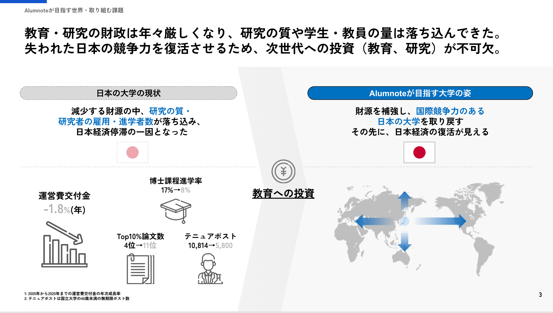 Alumnoteのミッションは、次世代(教育・研究)に資本が集まる仕組みを作ること