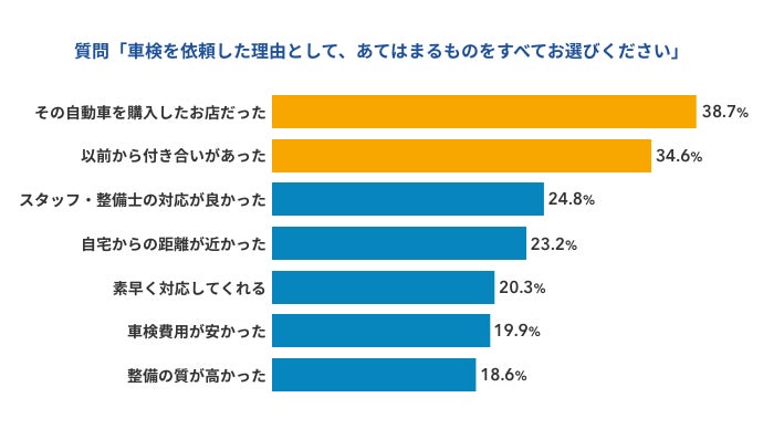 車検依頼先を選ぶ理由として最も多かったのは「その自動車を購入したお店だったから」(38.7%)、次いで「以前から付き合いがあったから」(34.6%)という結果となっています。