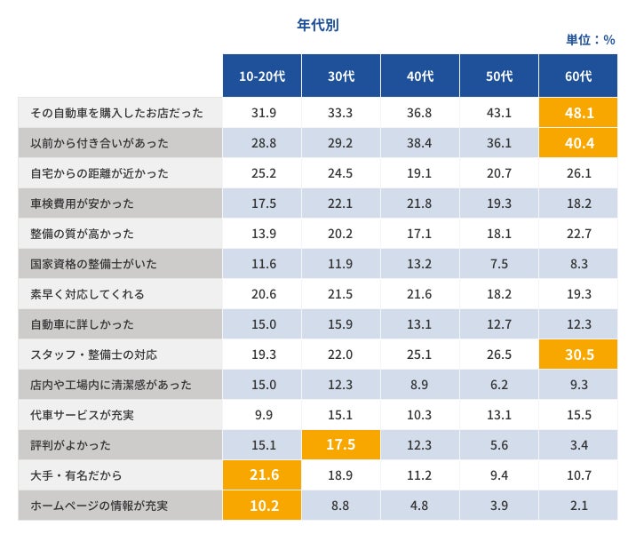 60代では「その自動車を購入したお店である」(48.1%)・「以前から付き合いがあった」(40.4%)。次いで「スタッフ・整備士の対応」(30.5%)が特徴的な回答になっています。