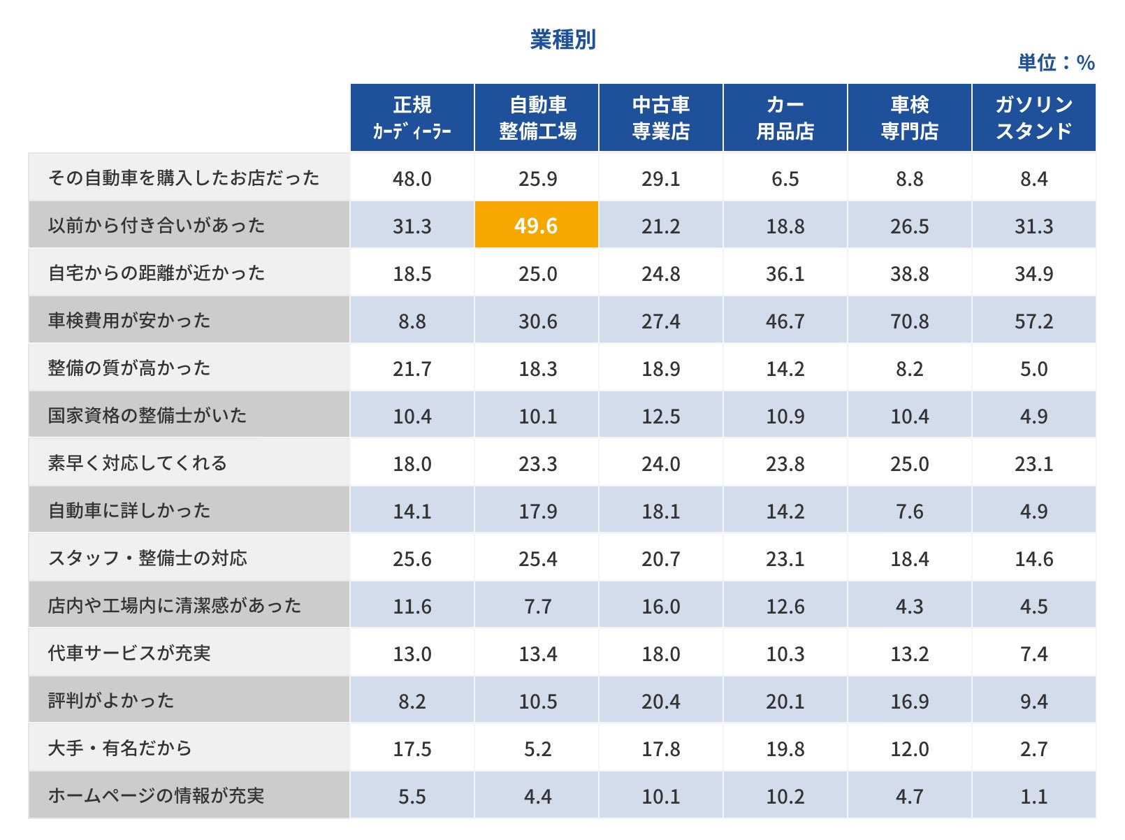 業態別に考察してみます。自動車整備工場で車検を依頼したカーオーナーに焦点をあてると、「以前から付き合いがある」(49.6%)とダントツNo.1という結果になり、他の業態の回答と比べてもとりわけ特徴的です。