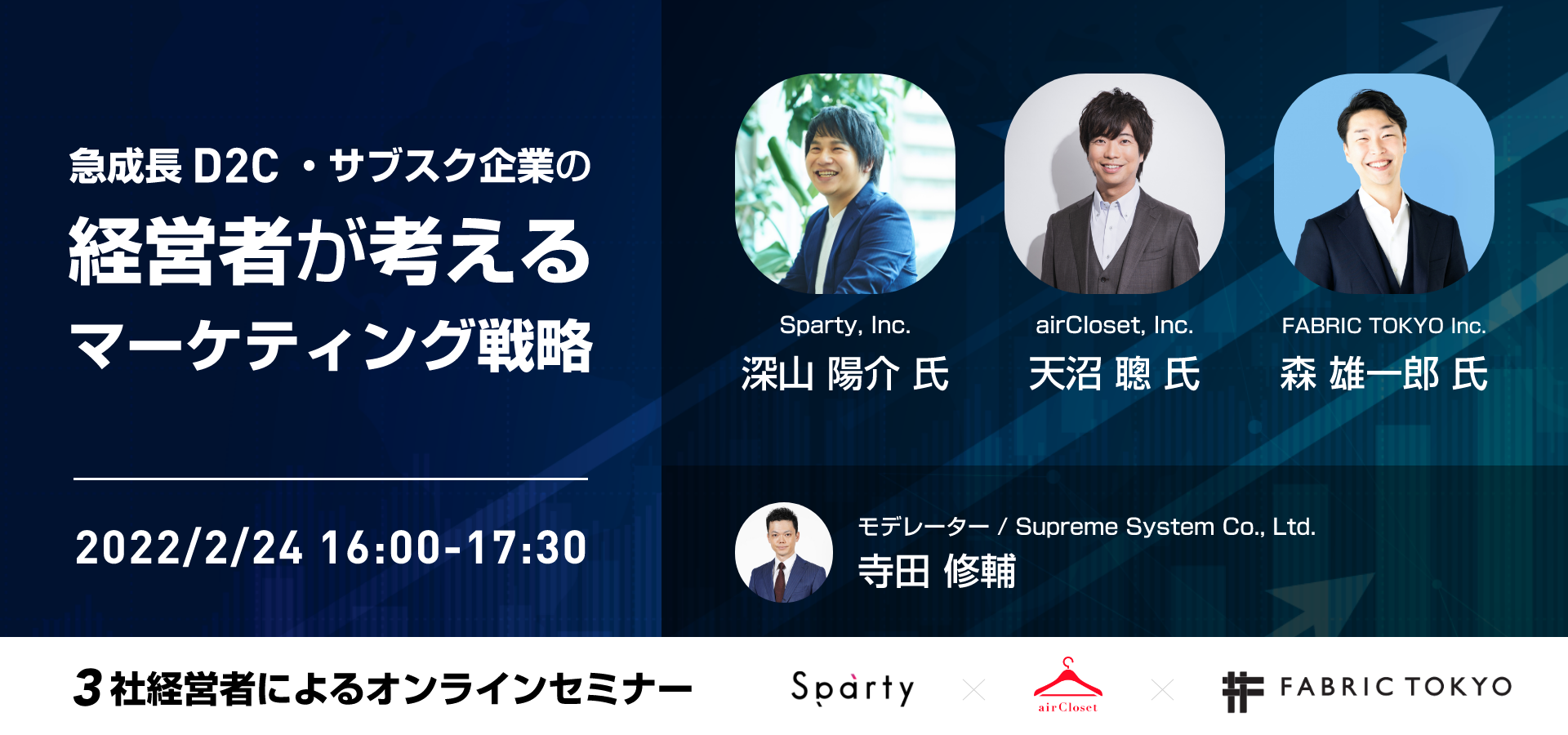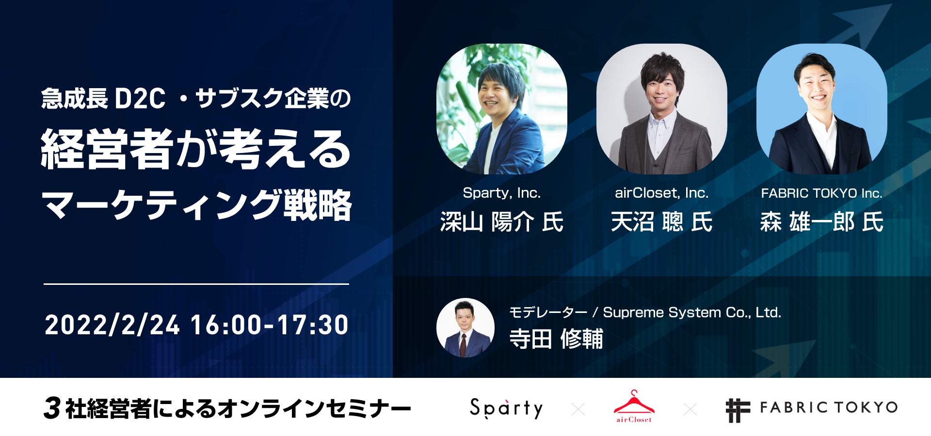 そこで、本ウェビナーではパーソナライズドマーケティングを実現するソフトウェア「aimstar」を提供するスプリームシステムが進行役となり、いま急成⻑中のD2C・サブスク企業CEOのお三方にマーケティングの本質を語っていただきました。