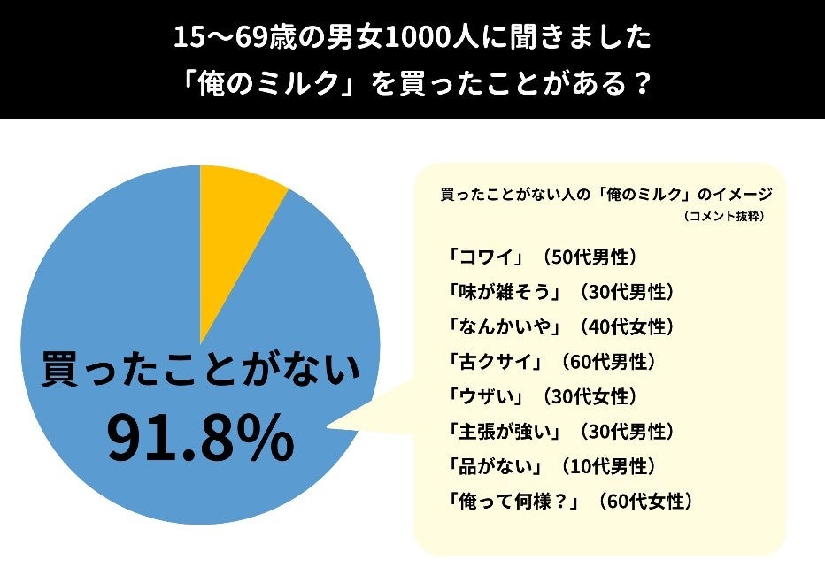 15〜69歳の男女1000人に調査したところ、「俺のミルク」を買ったことがある人は8.2%に留まった。実際、競合である他社のミルクキャンデーと比較しても、購入率が圧倒的に低いのは「俺のミルク」だった。