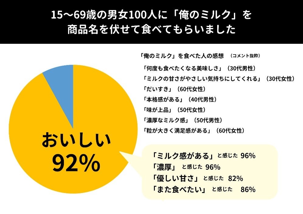 実際に商品名やパッケージを伏せて「俺のミルク」を食べてもらったところ、イメージ調査の結果とは大きく異なり、好反応が目立つ結果に。「おいしい」と答えた人は、92%にのぼった。食べた感想も「何度も食べたくなる美味しさ」「ミルクの甘さがやさしい気持ちにしてくれる」といった、イメージ調査で出てきたコメントからは一転した嬉しいコメントが多く見受けられた。