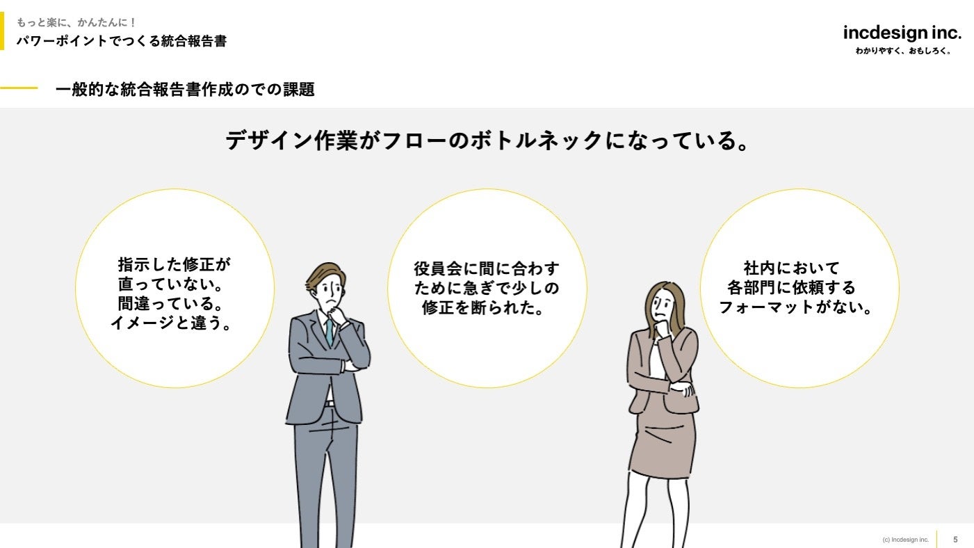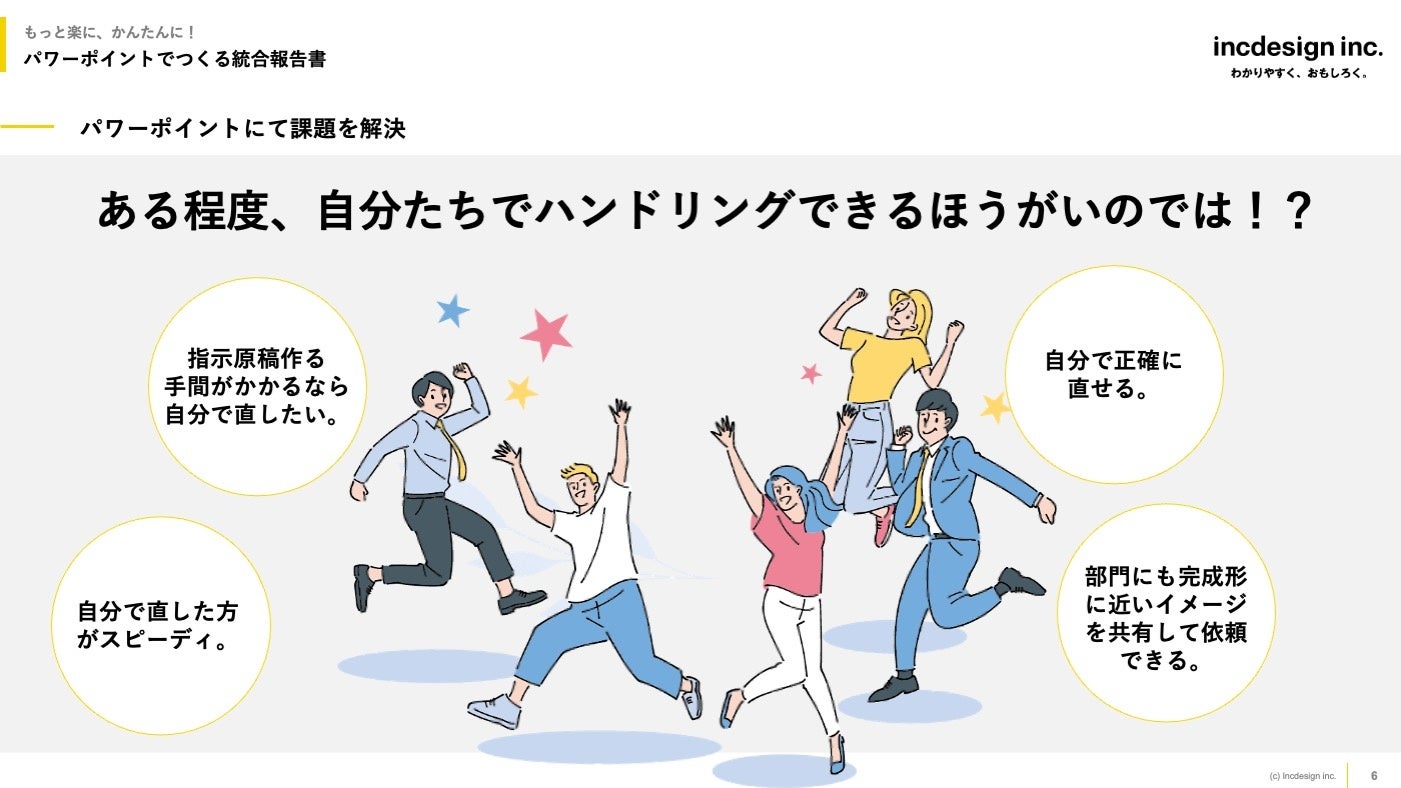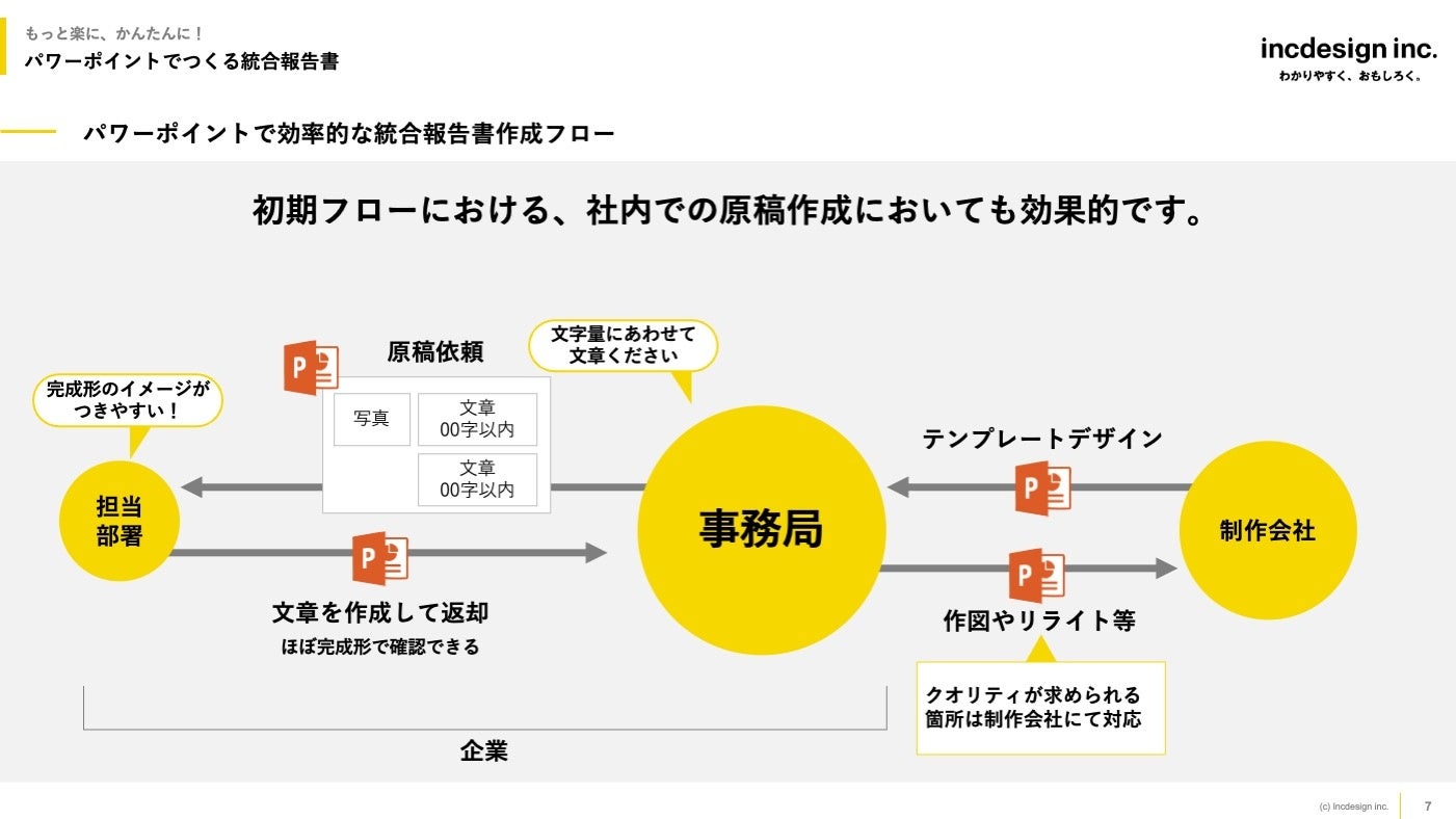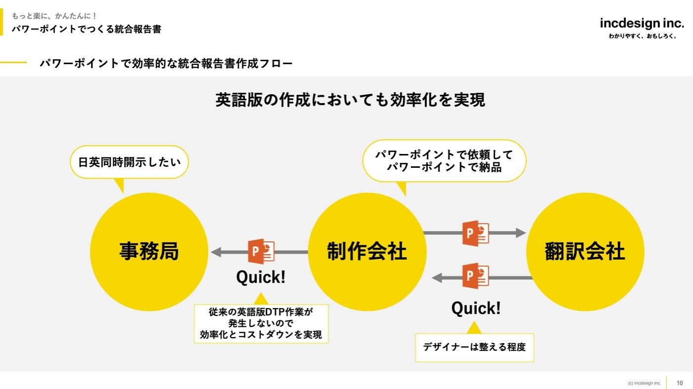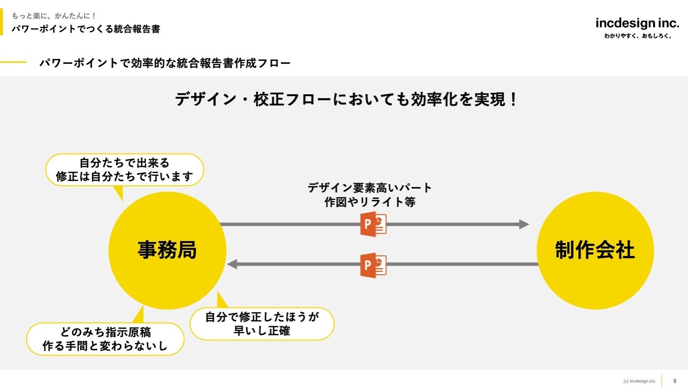 そのようなフローでは効率が良くないので、インクデザインでは、「統合報告書をパワーポイントで作ればいいいのでは?」という提案をします。