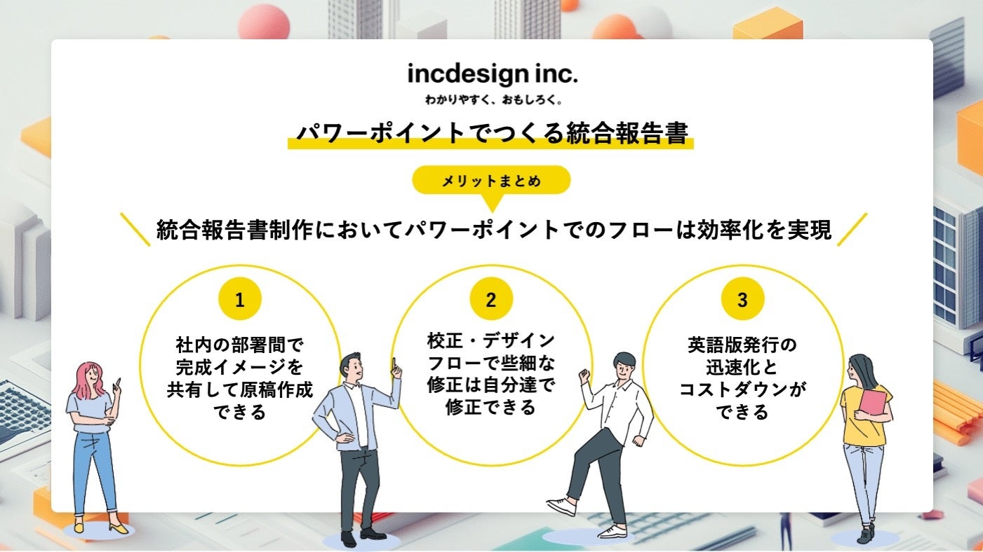 IRツール、コーポレートツールのデザインを提供するインクデザイン株式会社(本社:東京都墨田区 代表取締役:鈴木潤)は統合報告書制作の効率化が図れる「パワーポイントで作る統合報告書で省力化ソリューション」を提供します。