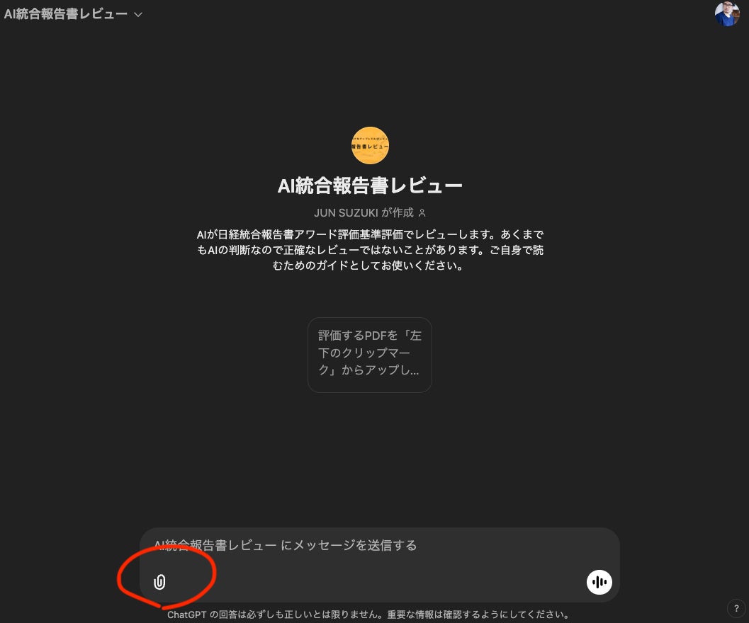 また、作業効率化の一環としてカスタムchatGPTにて、簡易的な統合報告書のレビューを行うチャットボットも作ってみました。