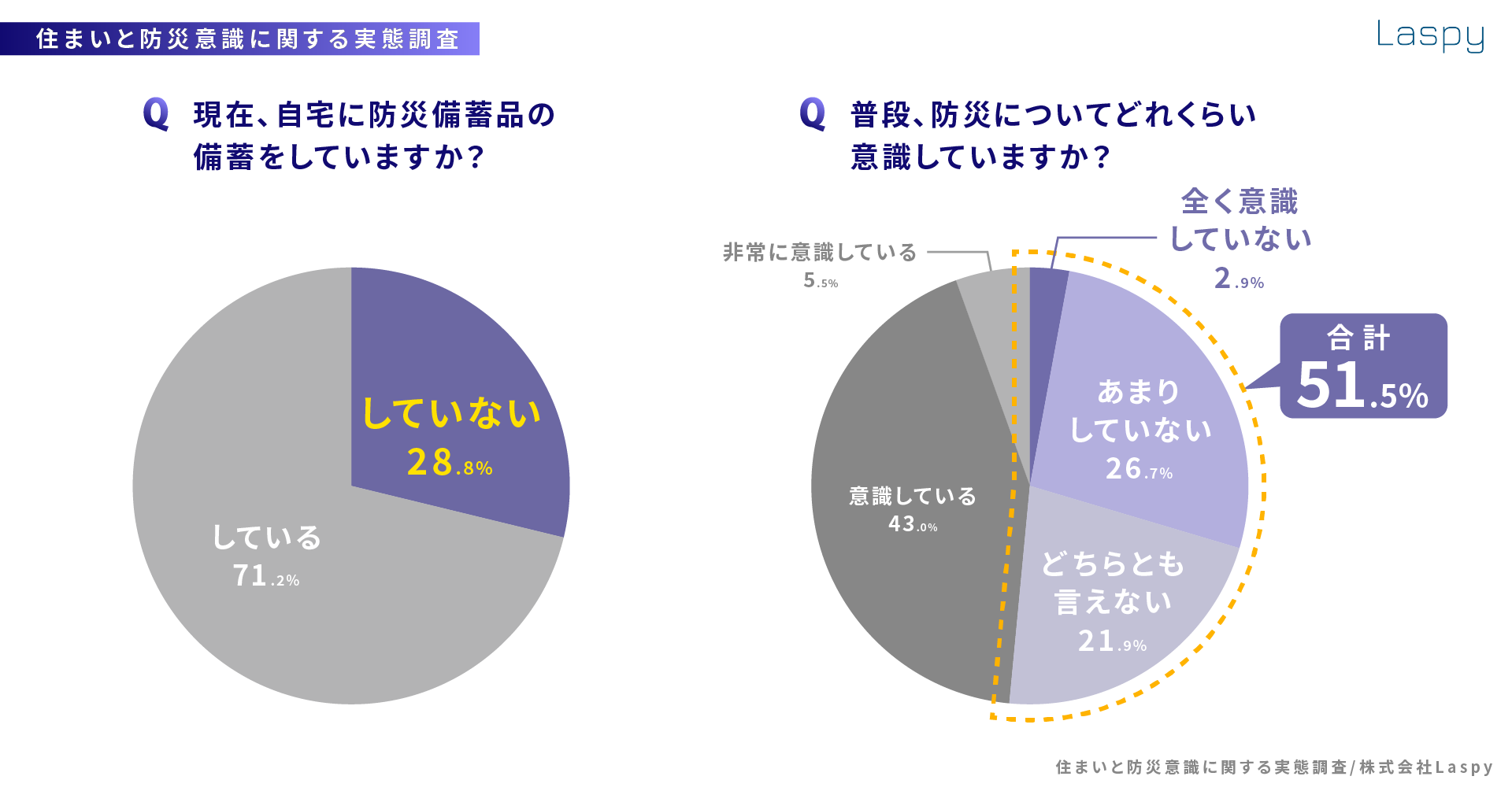 また、防災意識については「全く意識していない」「あまり意識していない」「どちらともいえない」の合計は51.5%にものぼり、「非常に意識している/意識している」と回答した人を上回る結果となりました。