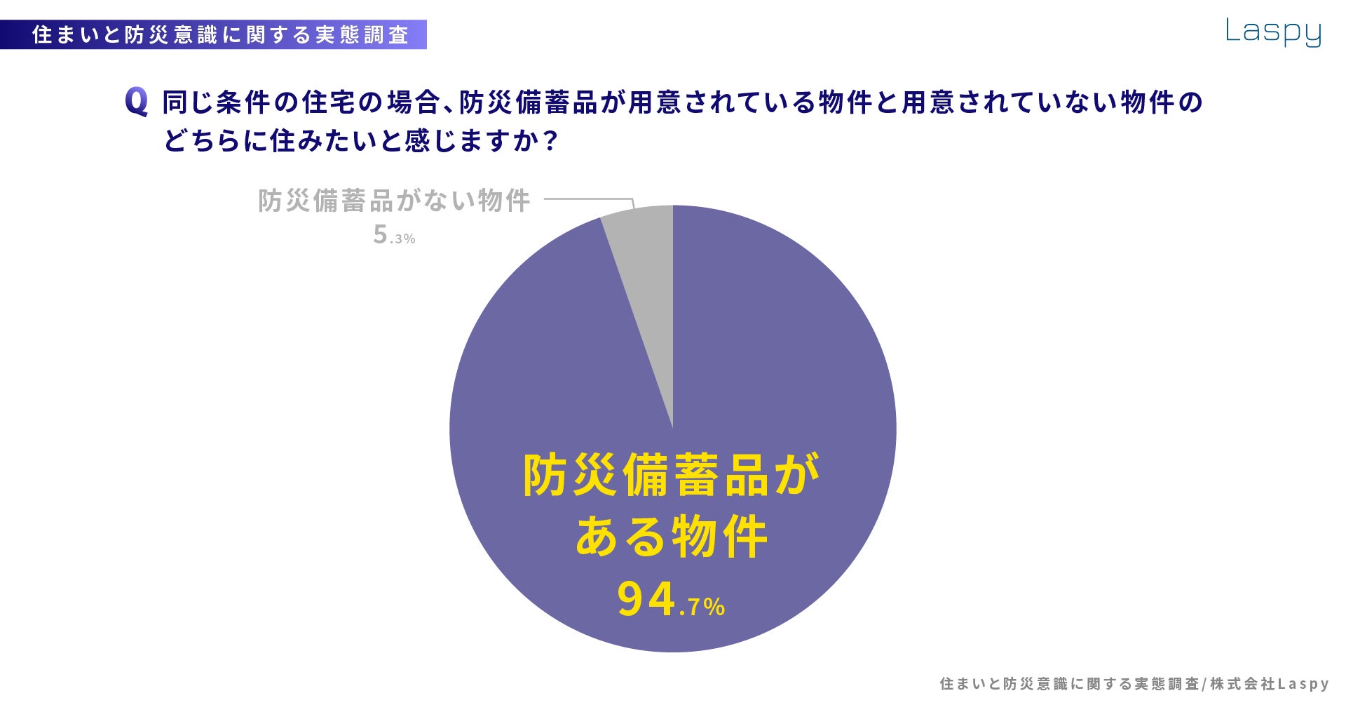 さらに、その他の条件が同じ場合には「防災備蓄品が備わっている物件に住みたい」と回答した人が94.7%にものぼり、集合住宅において防災備蓄品が用意されていることは多くの方にとって好印象であることも明らかとなりました。