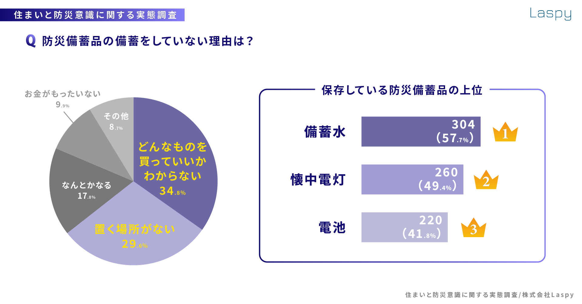 | ・日頃の防災備蓄「している」が71.2%(≒4人に1人が「していない」) ・防災意識「している」が最多の43.0%、「あまりしていない」26.7%、「どちらともいえない」21.9% ・防災備蓄品の上位 1位:水(304票≒57.7%) 2位:懐中電灯(260票≒49.4%) 3位:電池(220票≒41.8%) ・備蓄していない理由の1位「どんな物を買っていいか分からない」が最多の34.8% 「置く場所がない」の29.6%と合わせて6割超を占めた ・集合住宅が提供する備蓄品「ある」と回答したのは全体のわずか19%、「ない」が最多45.5% ・集合住宅に備えて置いて欲しい防災備蓄品の上位 1位:水(457票≒81.3%) 2位:ブランケット・毛布(260票≒62.9%) 3位:簡易トイレ(220票≒53.7%) ・「条件が同じであれば備蓄品が用意されている物件に住みたい」という回答が95%にのぼった |