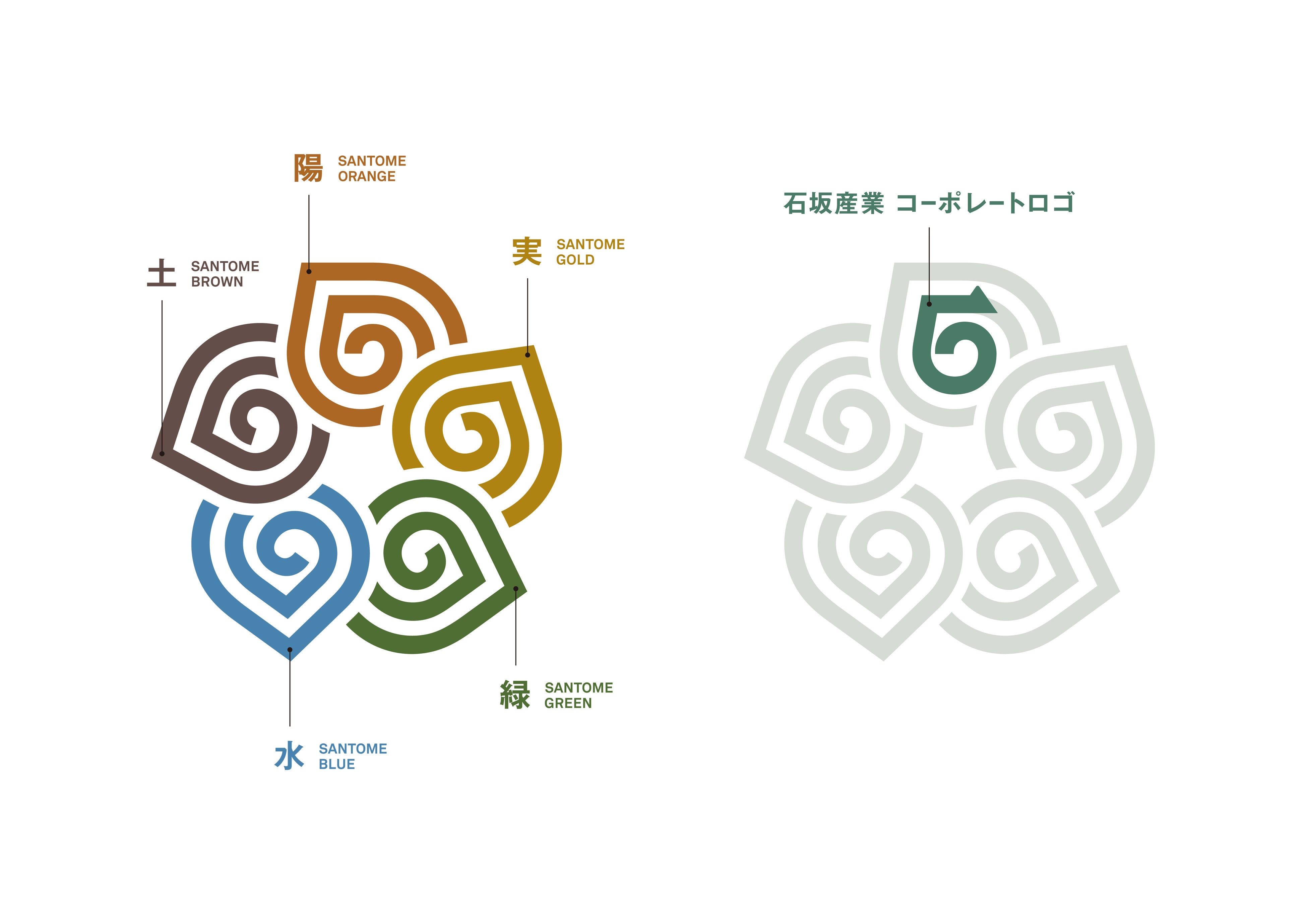 このマークはこのスローガンを体現していて、5つの循環する陽・実・緑・水・土を表すスパイラルが、輪になっています。1つ1つのスパイラルの形の中心には、よく見ると石坂産業のマークが隠れています。