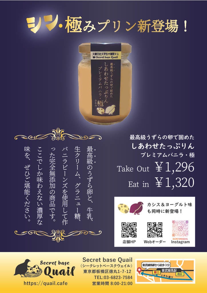 大東文化大学生が経営するSecret base Quailの新メニュー!高級・希少なうずら卵を使った「しあわせたっぷりん 【プレミアムバニラ・極み】」を発売します!!