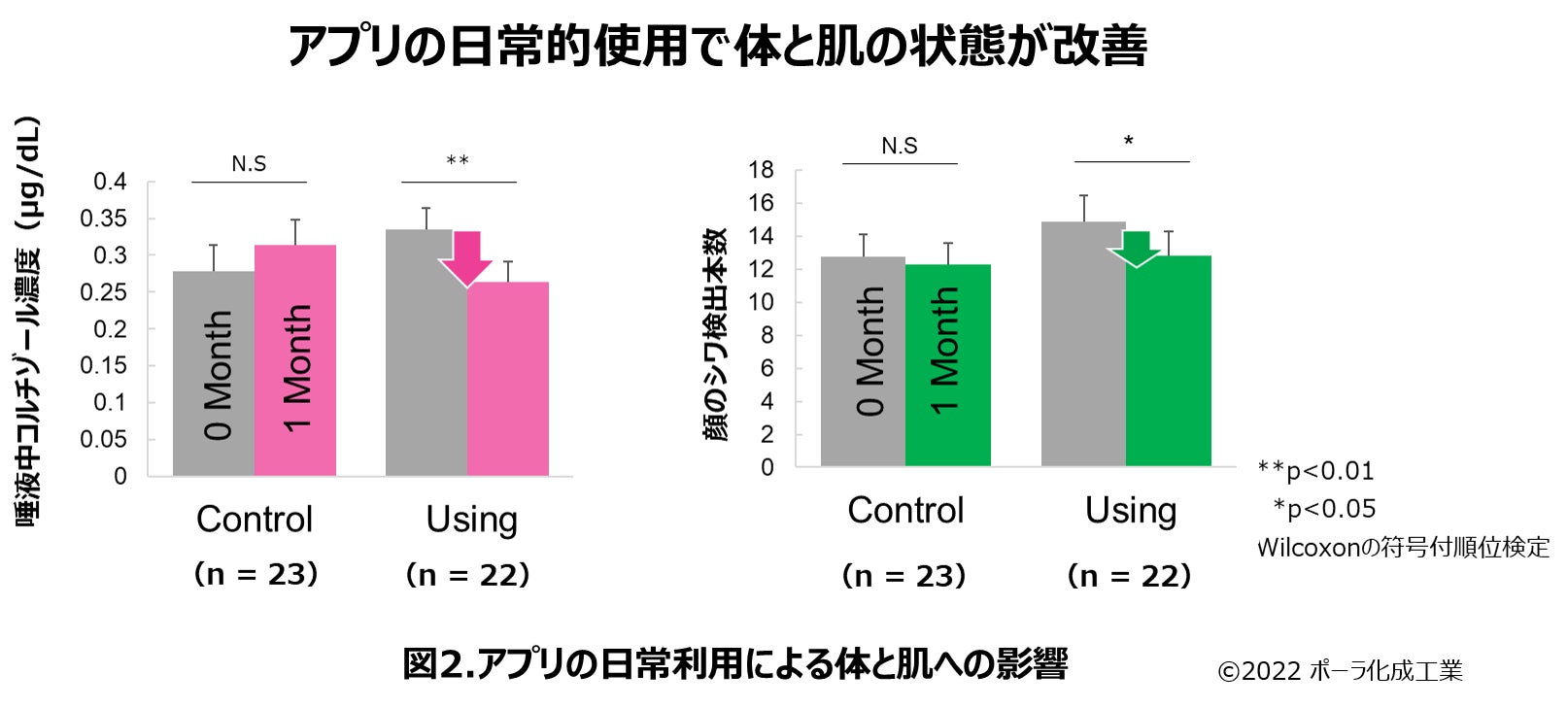 25~59歳の男性45名を2群にわけ、23名は「アプリ不使用群」、22名は「アプリ使用群」としました。1か月間、「アプリ不使用群」は普段通りの生活を、「アプリ使用群」はアプリ使用を自由に生活の中に取り入れてもらい、体と肌の状態の変化を解析しました。その結果、「アプリ使用群」でのみ、唾液中コルチゾール(ストレスの指標)とシワ本数(※1)の改善が確認されました(図2)。