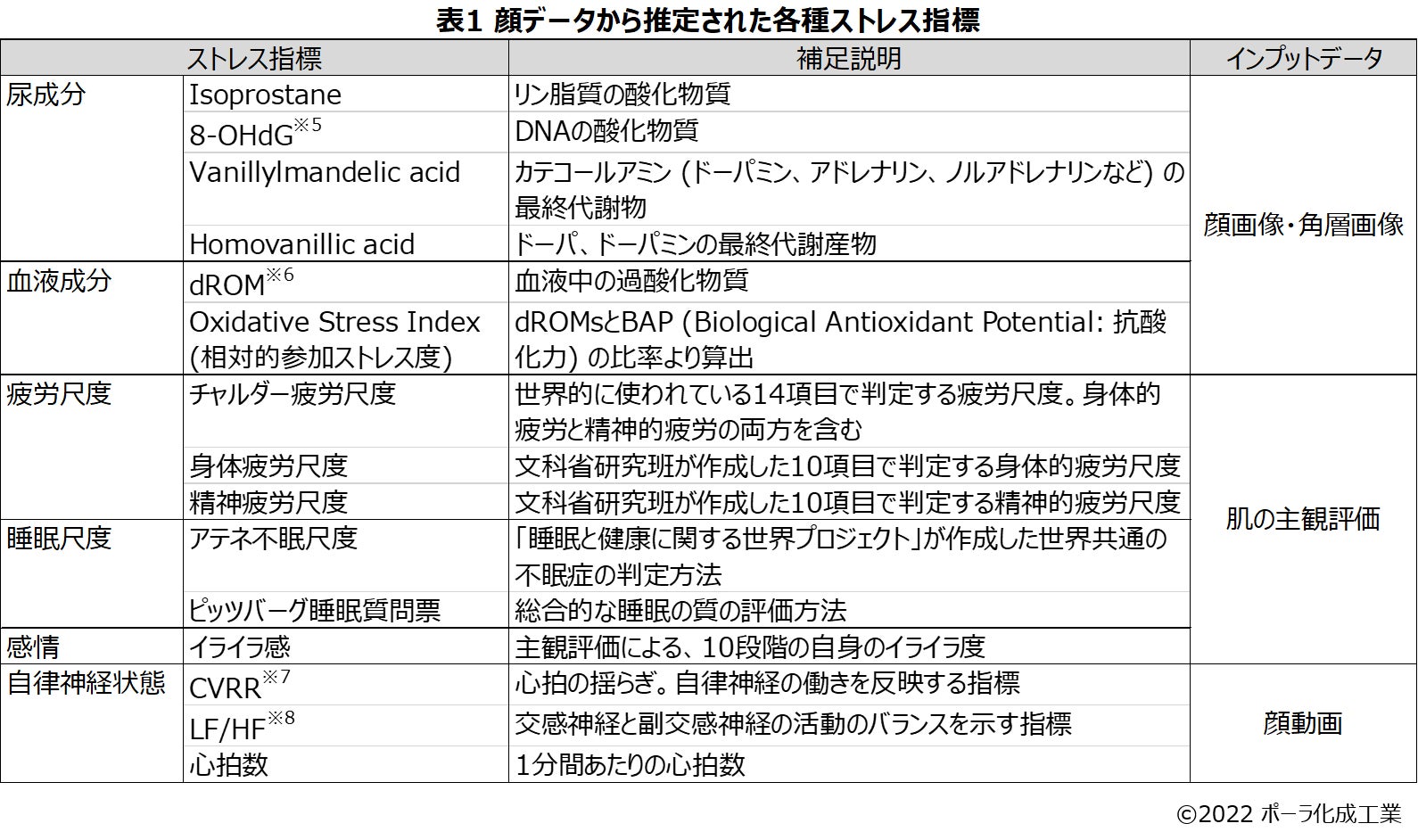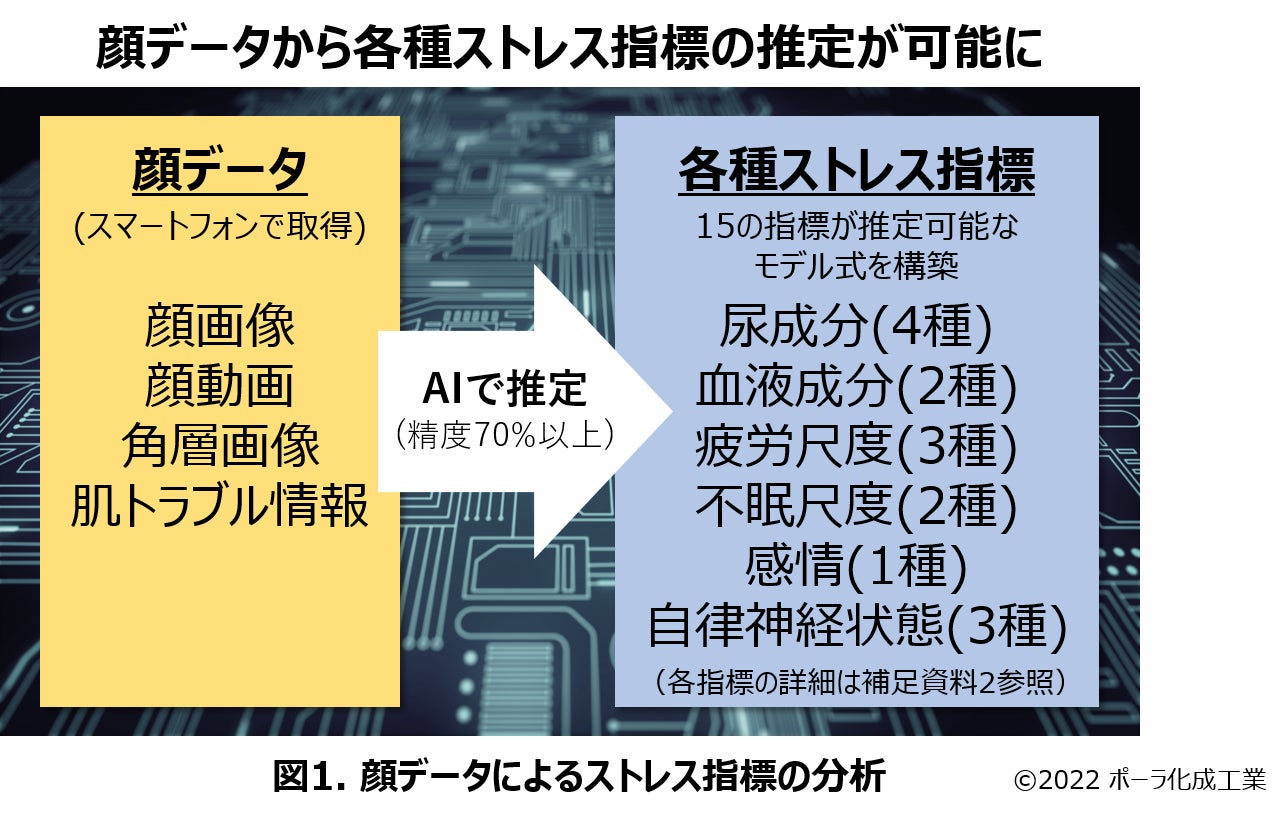 ① 顔データ(顔画像・動画、角層画像など)を用いて、ストレス状態(体内疲労マーカー、自律神経状態など)を推定できる分析技術を確立(図1)