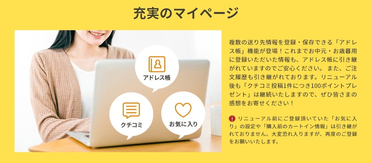 ◆複数の送り先情報を登録・保存できる「アドレス帳」を新機能として追加しました。また、リニューアル後も「ご注文履歴」や「クチコミ1件につきトラベルポイント100Pプレゼント」は継続します。※リニューアル時にご登録いただいていた「お気に入り」の設定や「購入前のカートイン情報」は引き継がれておりません。大変恐れ入りますが、再度ご登録をお願いします。