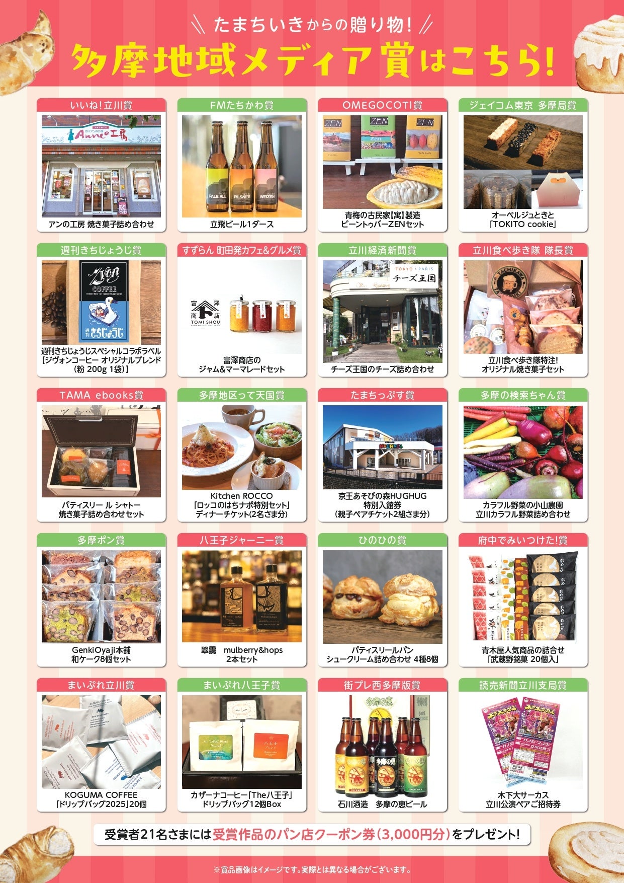 入賞作品には、大賞「パン沼ずぶずぶ賞」のほか、各メディアが厳選した多摩地域の銘品や体験ギフトなど、特色豊かな賞品を贈呈します。